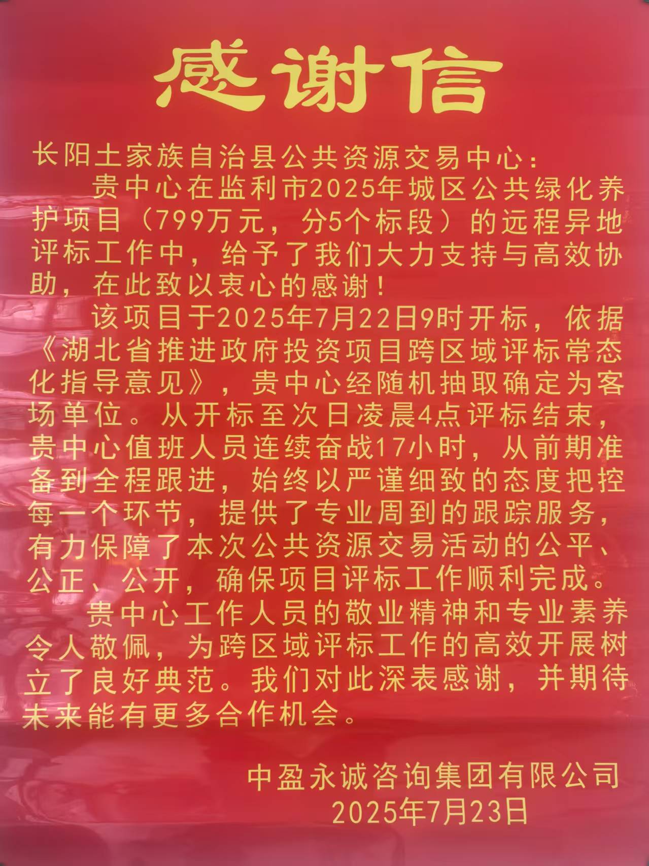 近日,中盈永诚咨询集团有限公司向长阳公共资源交易中心发来感谢信,对交易中心在政府采购跨区域评审工作中的高效协作表示衷心感谢。