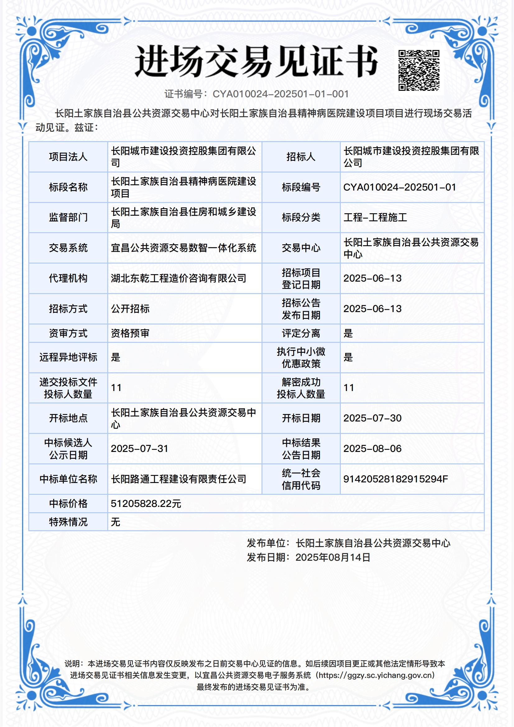 近日,长阳土家族自治县精神病医院建设项目的中标单位——长阳路通工程建设有限责任公司通过全国公共资源交易平台(宜昌市▪长阳),成功下载了编号“CYA010024--202501-01-001”电子版《进场交易见证书》。这标志着长阳自治县公共资源交易中心“进场交易见证书”功能模块正式上线运行。