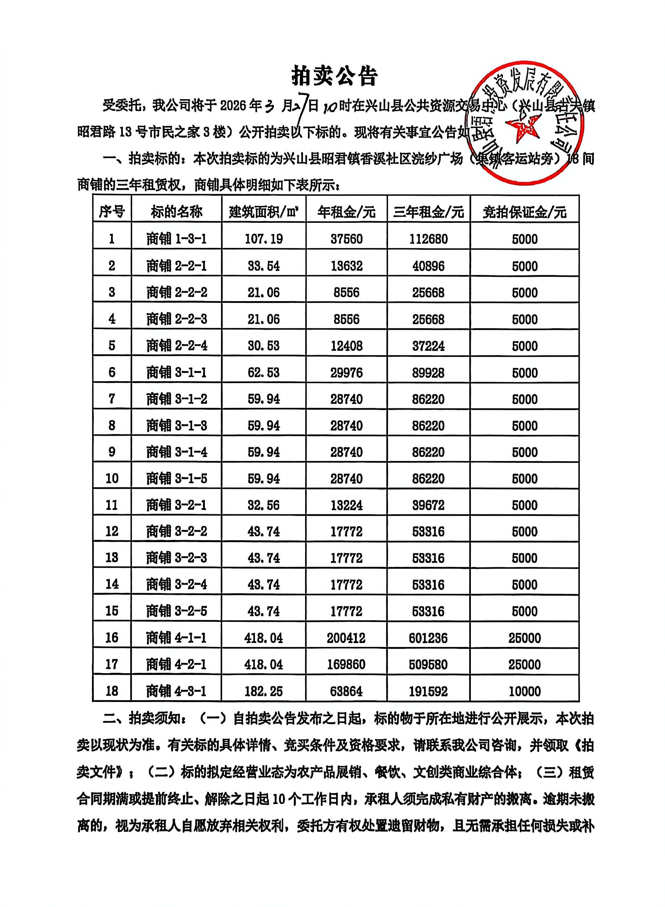 兴山县君朝投资发展有限责任公司昭君镇香溪社区浣纱广场(集镇客运站旁)商铺三年租赁权拍卖公告(第二次)
