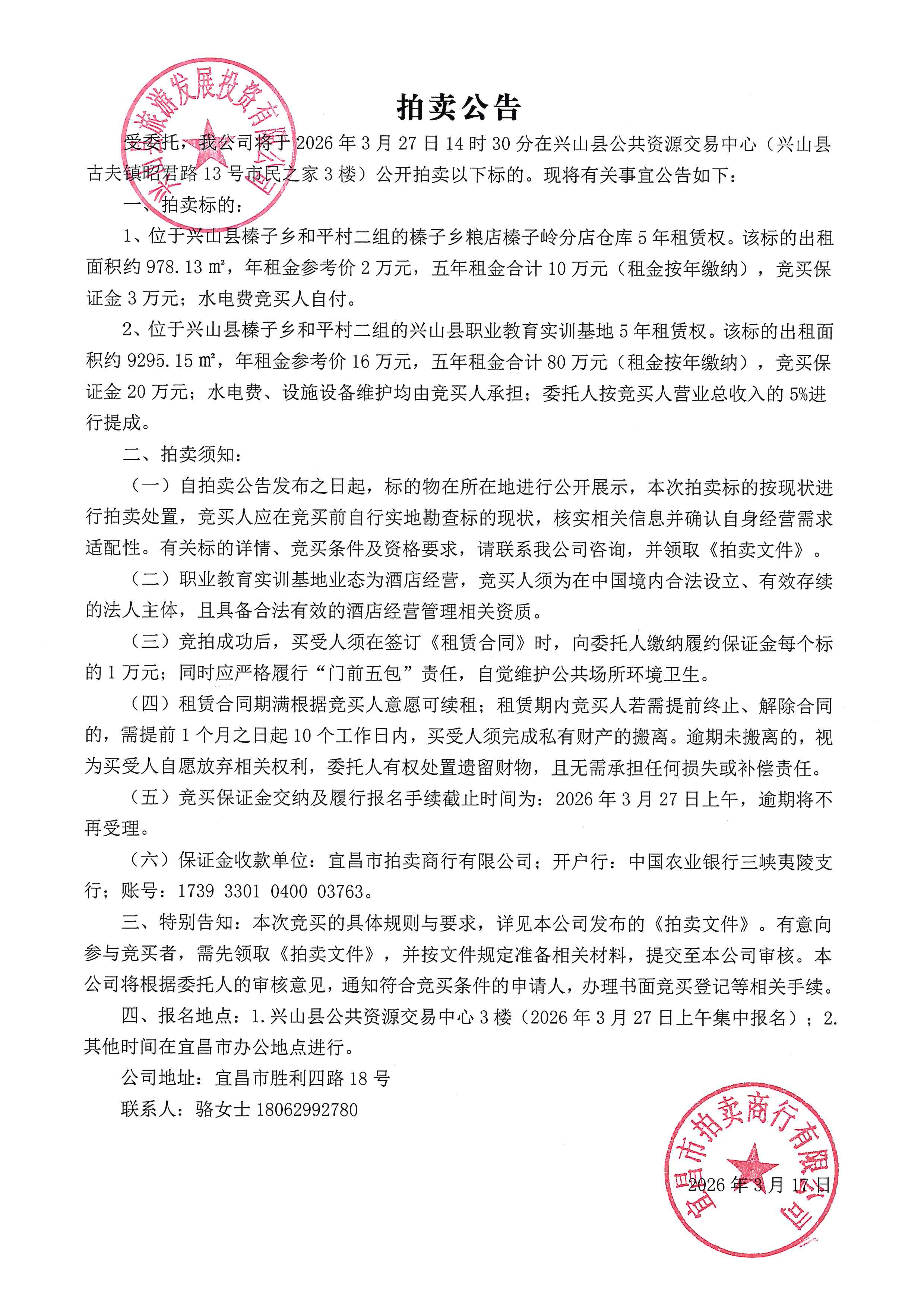 兴山县榛子乡和平村二组的榛子乡粮店榛子岭分店仓库及兴山县职业教育实训基地5年租赁权拍卖公告