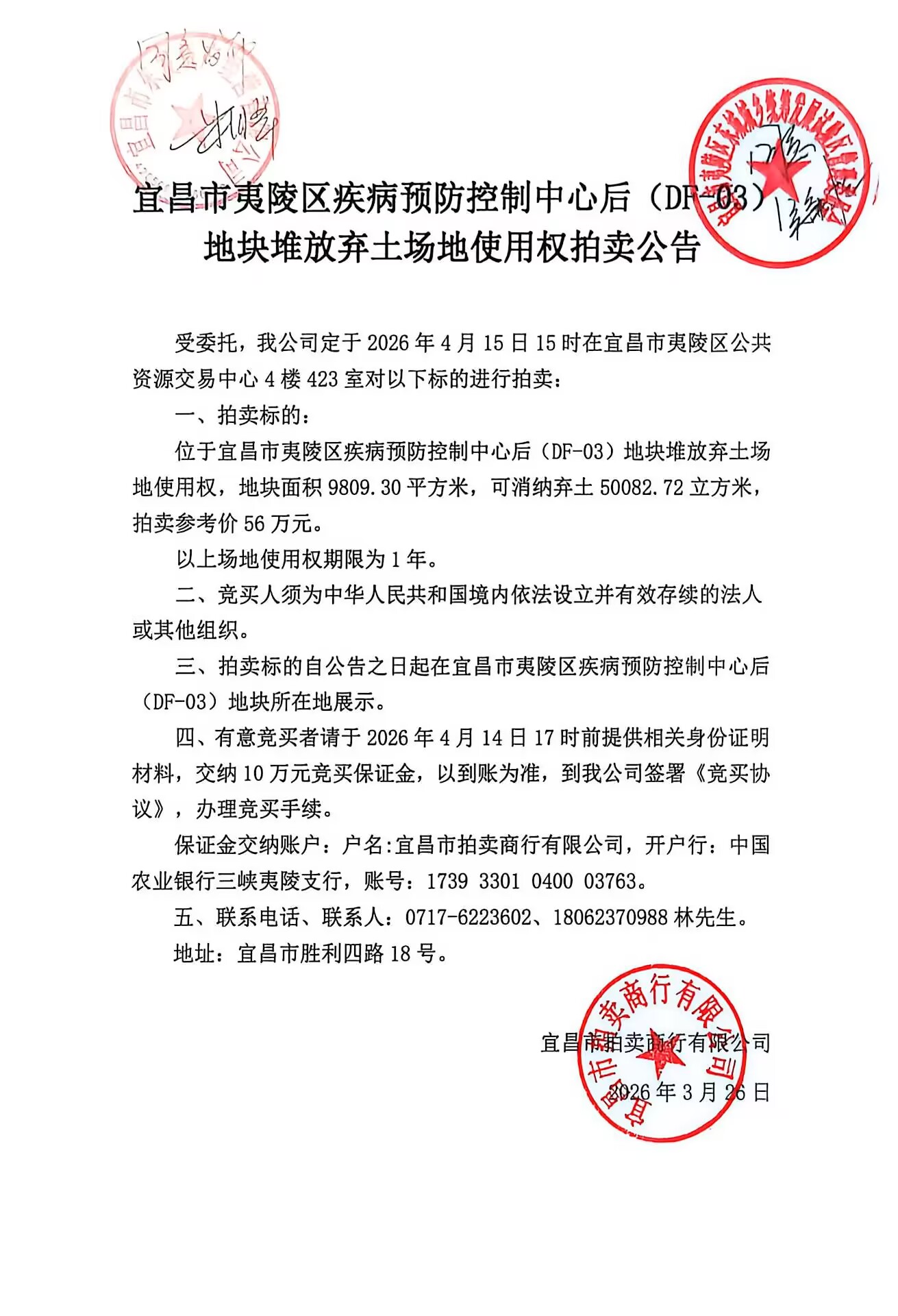 宜昌市夷陵区疾病预防控制中心后(DF-3)地块堆放弃土场地使用权拍卖公告
