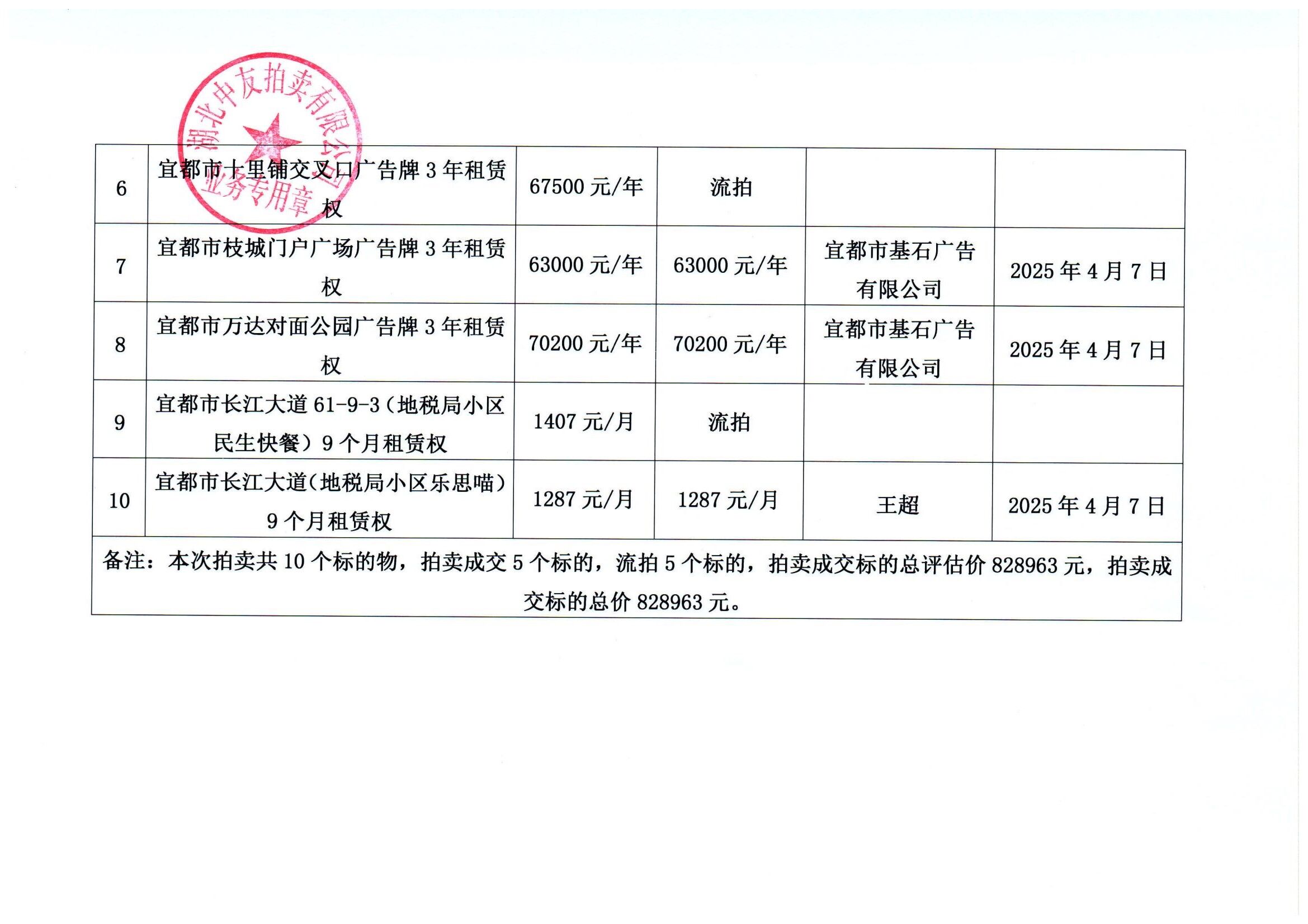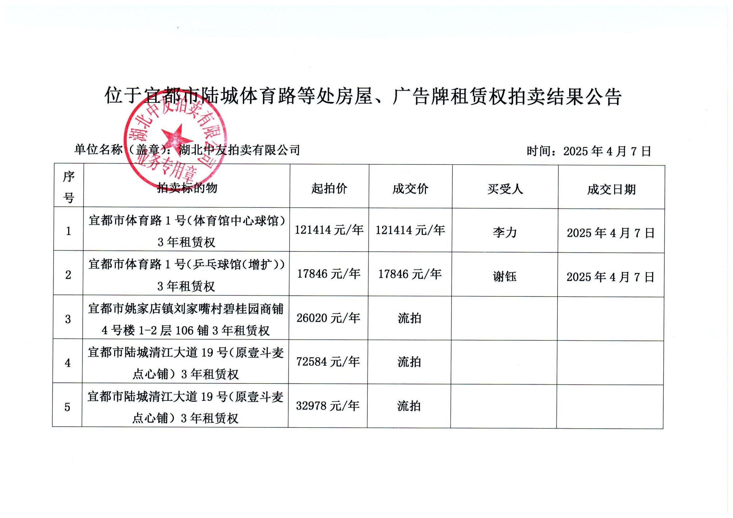 位于宜都市陆城体育路等处房屋、广告牌租赁权拍卖结果公告