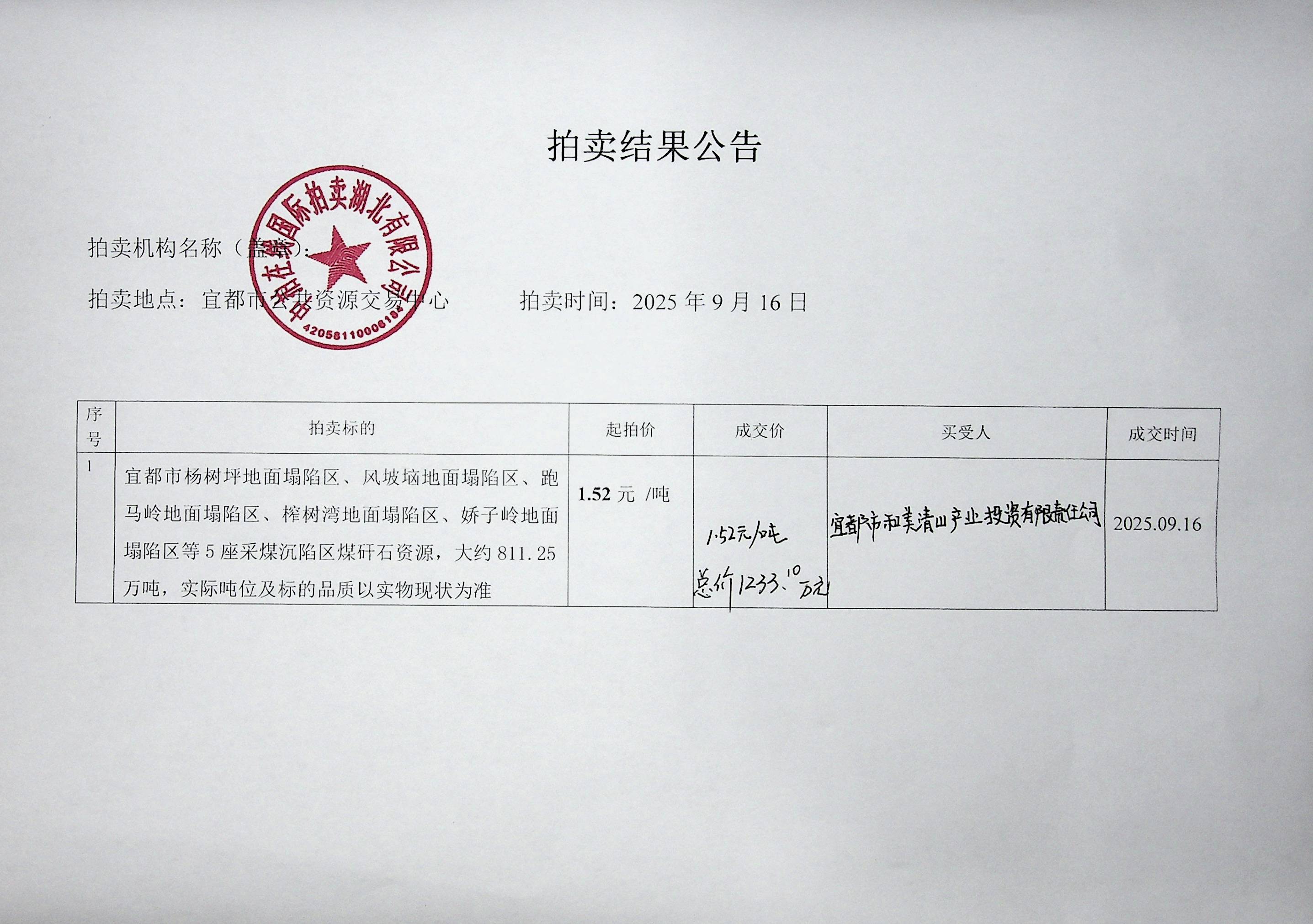 宜都市杨树坪地面塌陷区等5座采煤沉陷区煤矸石资源拍卖结果公告