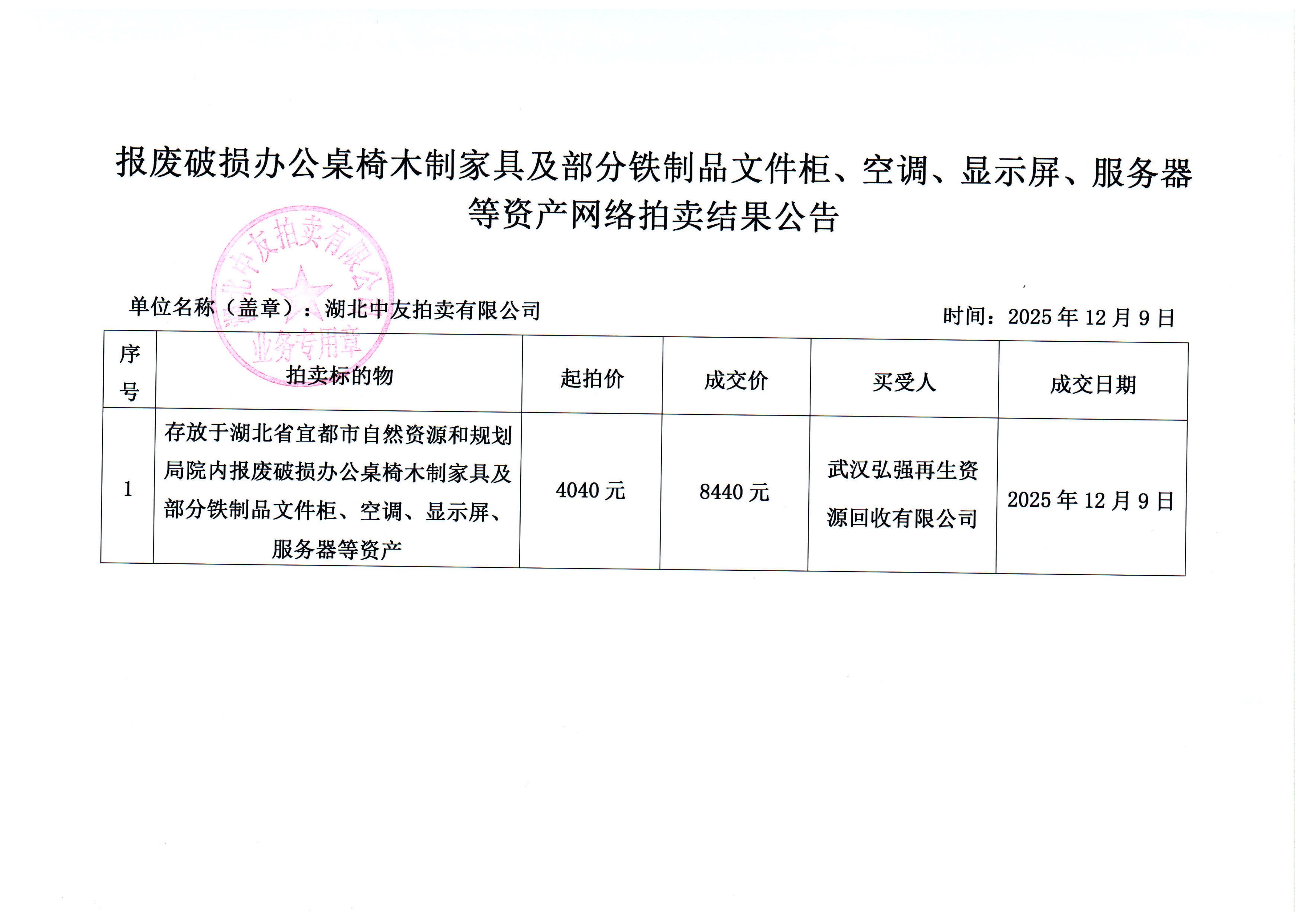 报废破损办公桌椅木制家具及部分铁制品文件柜、空调、显示屏、服务器等资产 网络拍卖结果公告
