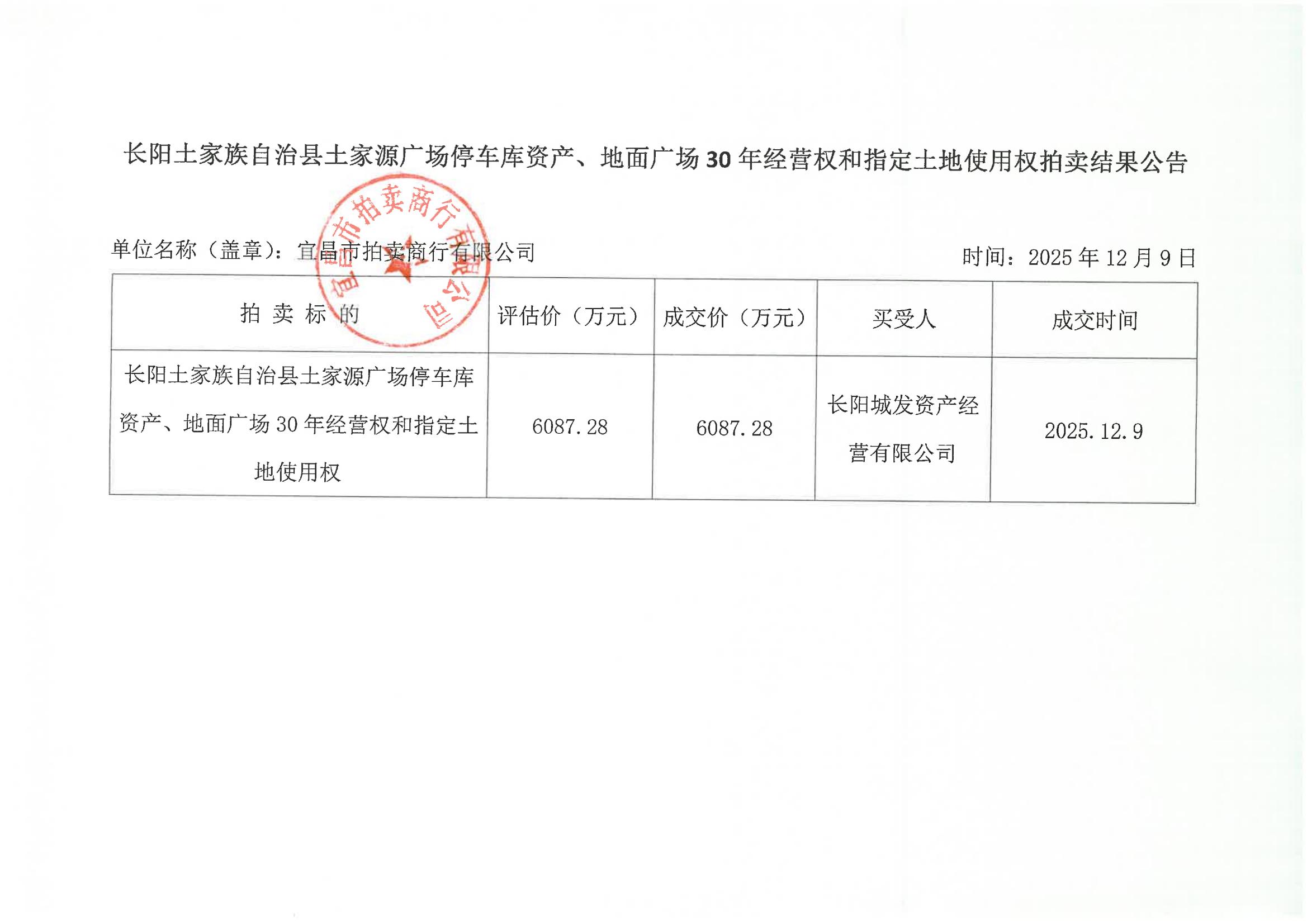 长阳土家族自治县土家源广场停车库资产、地面广场30年经营权和指定土地使用权拍卖结果公告