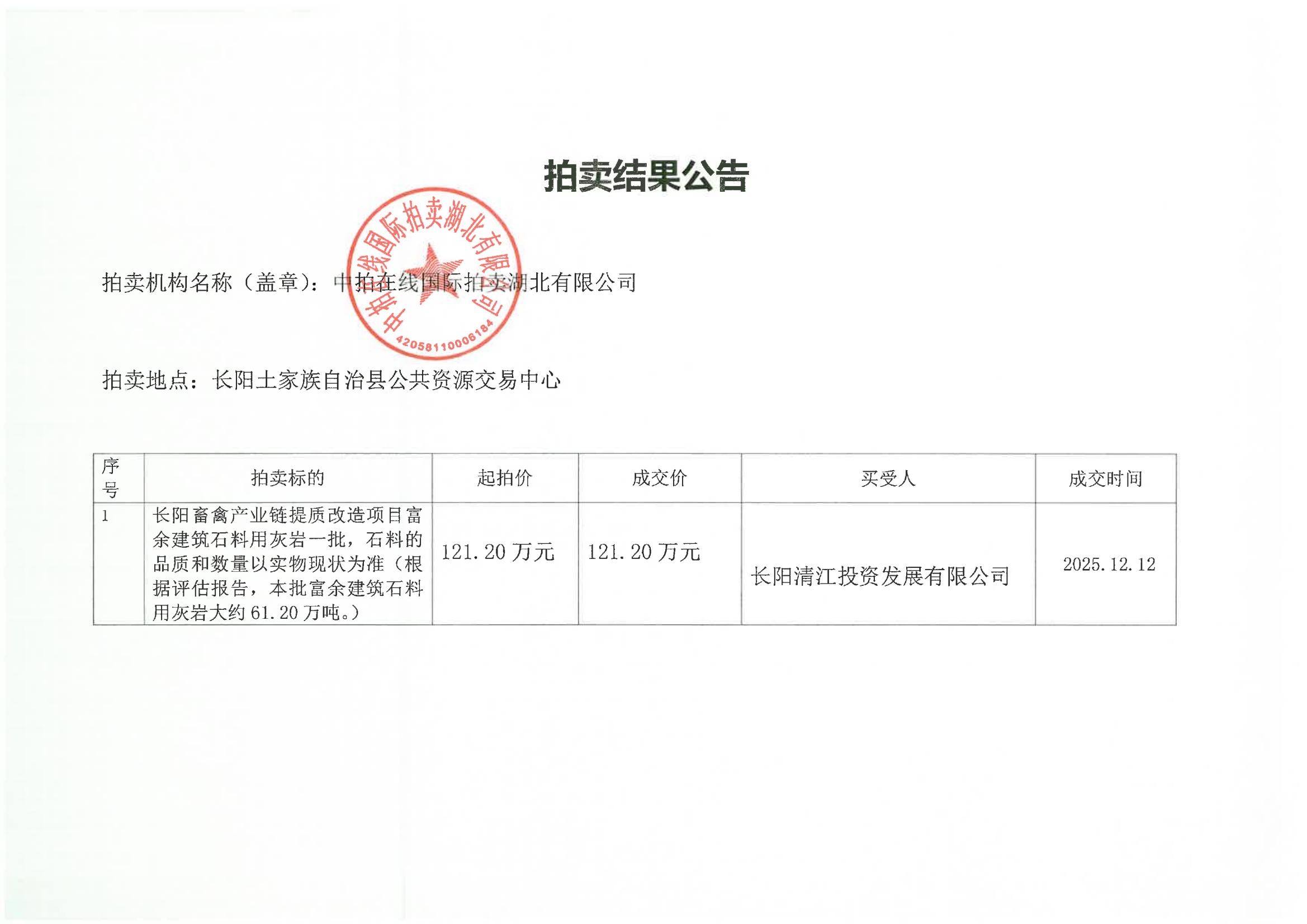 长阳畜禽产业链提质改造项目富余建筑石料用灰岩一批拍卖结果公告
