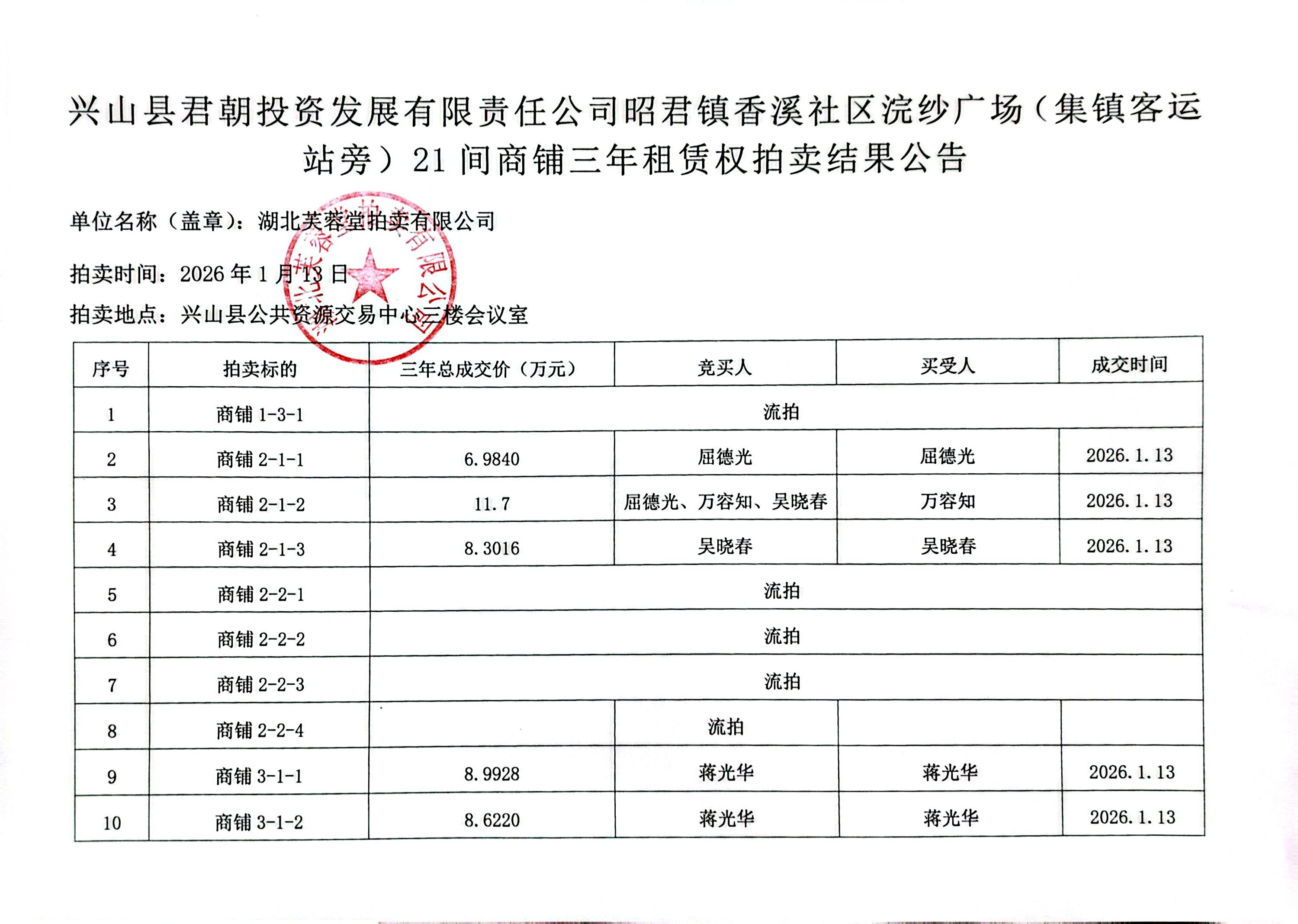 兴山县君朝投资发展有限责任公司昭君镇香溪社区浣纱广场(集镇客运站旁)21间商铺三年租赁权拍卖结果公告