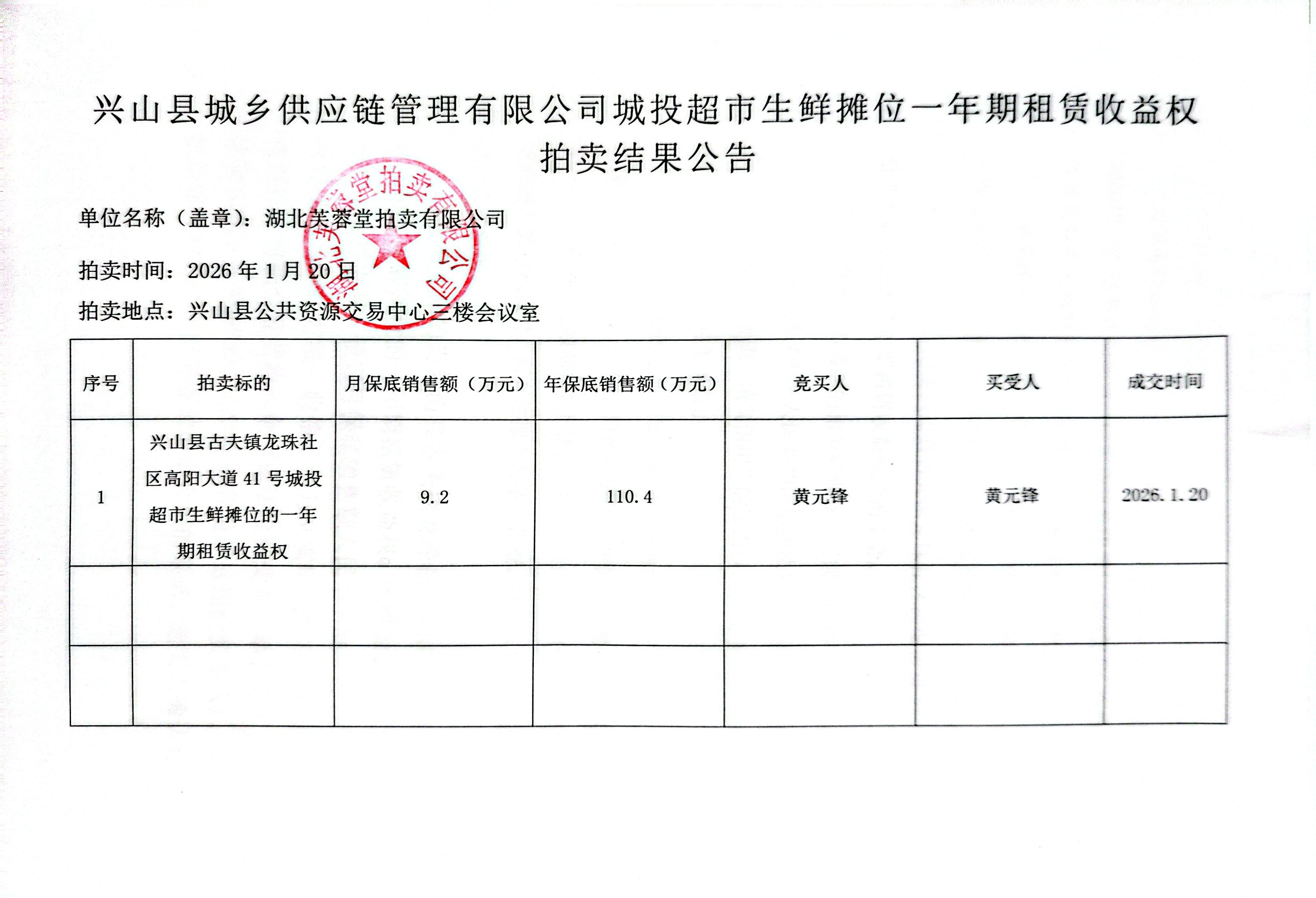 兴山县城乡供应链管理有限公司城投超市生鲜摊位一年期租赁收益权拍卖结果公告