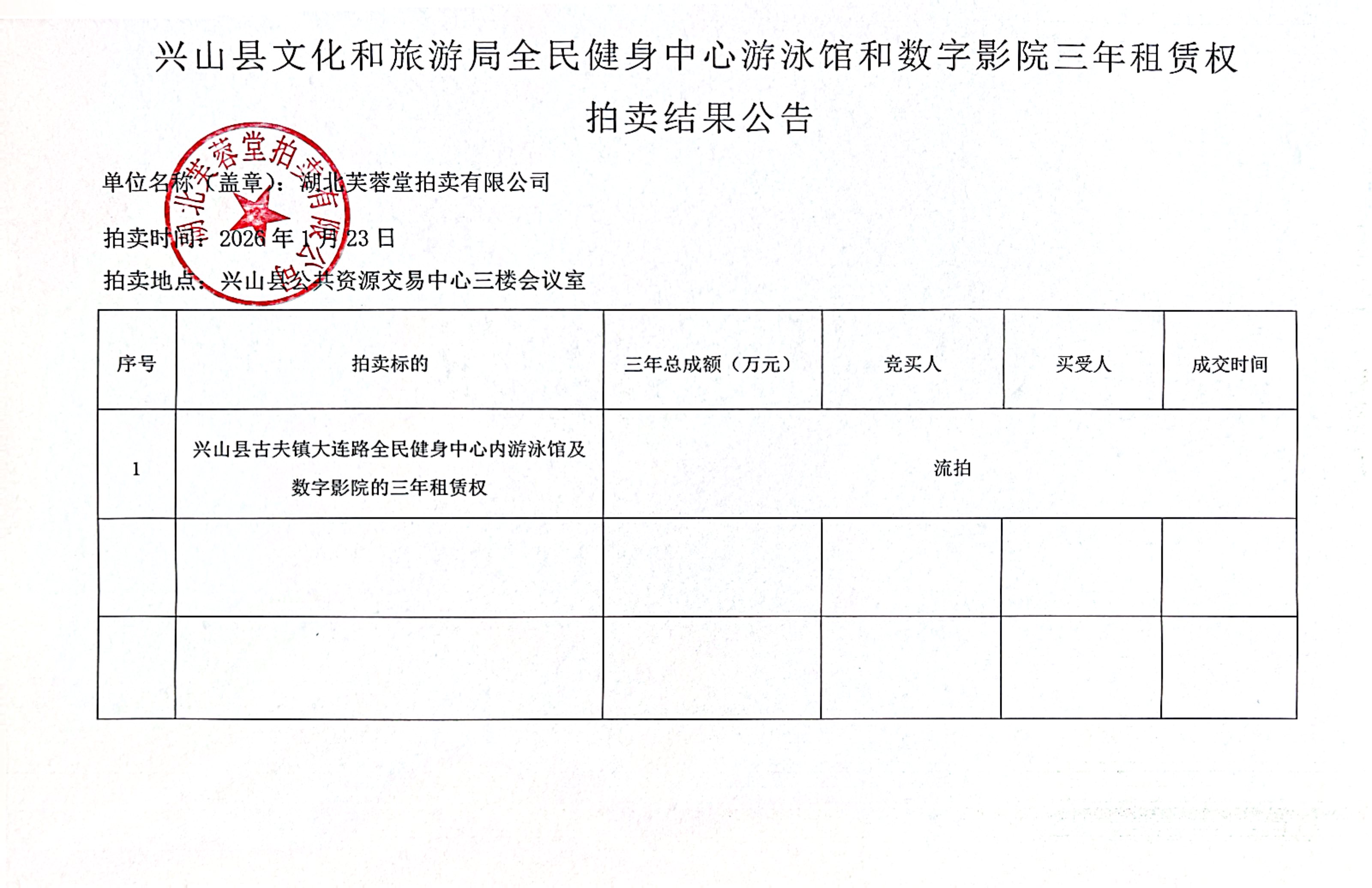 兴山县文化和旅游局全民健身中心游泳馆和数字影院三年租赁权拍卖结果公告
