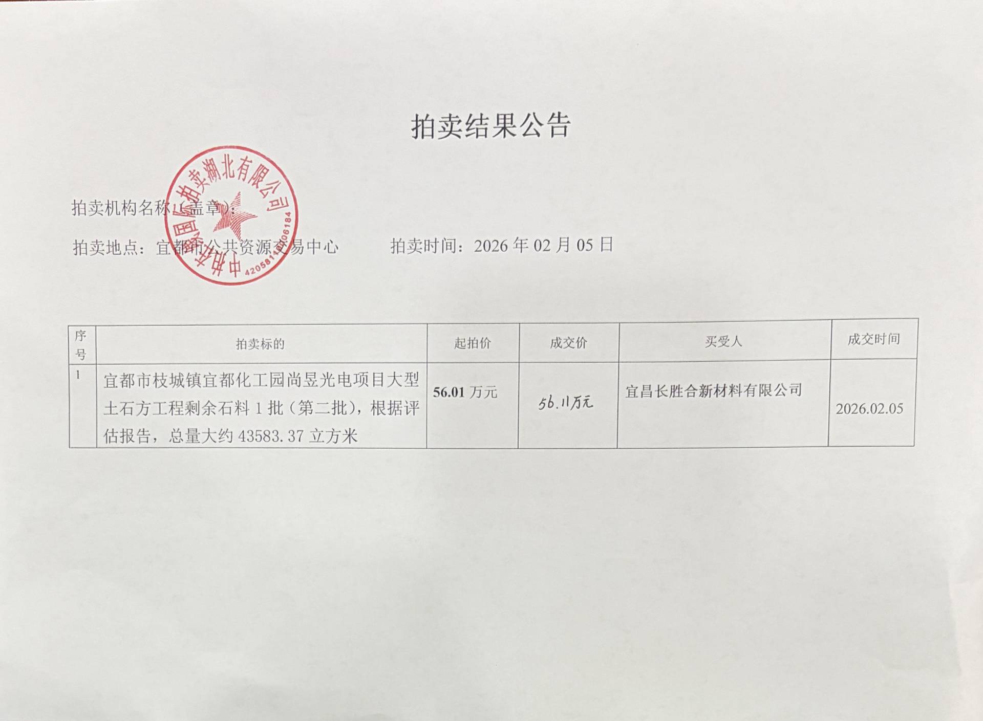 宜都高新技术产业园区管理委员会宜都化工园尚昱光电项目大型土石方工程剩余石料(第二批)拍卖结果公告
