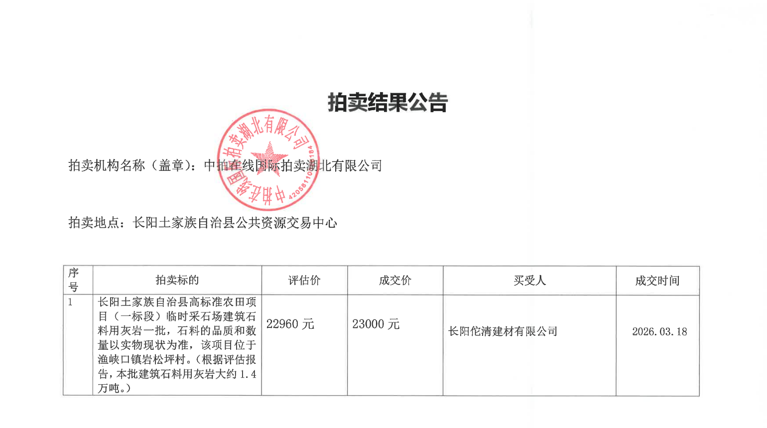 长阳土家族自治县高标准农田项目(一标段)临时采石场建筑石料用灰岩拍卖结果公告