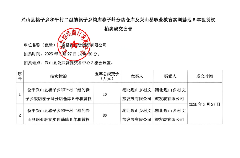 兴山县榛子乡和平村二组的榛子乡粮店榛子岭分店仓库及兴山县职业教育实训基地5年租赁权拍卖成交公告