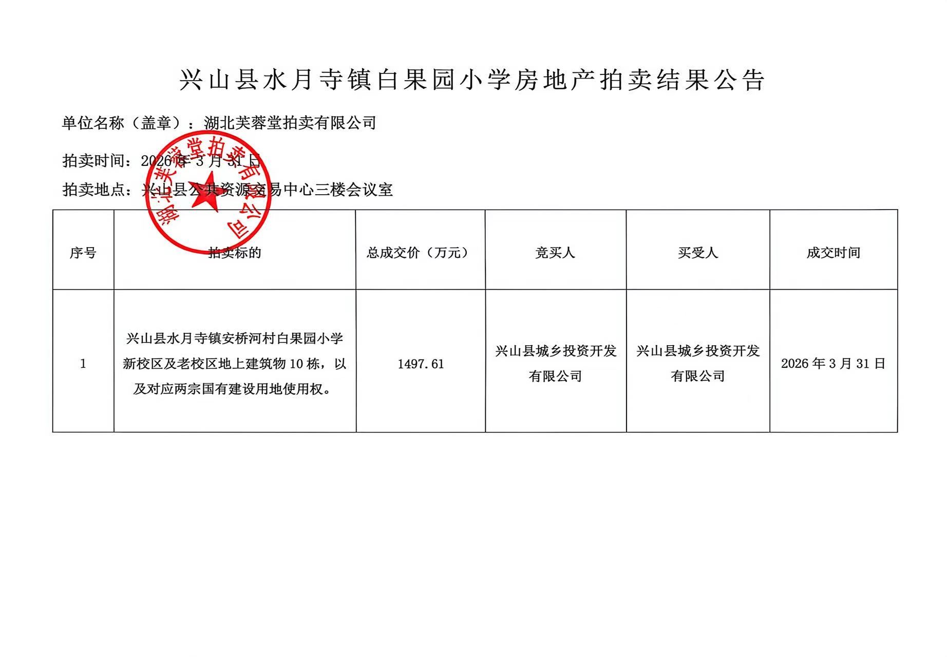 兴山县水月寺白果园小学房地产拍卖成交结果公告