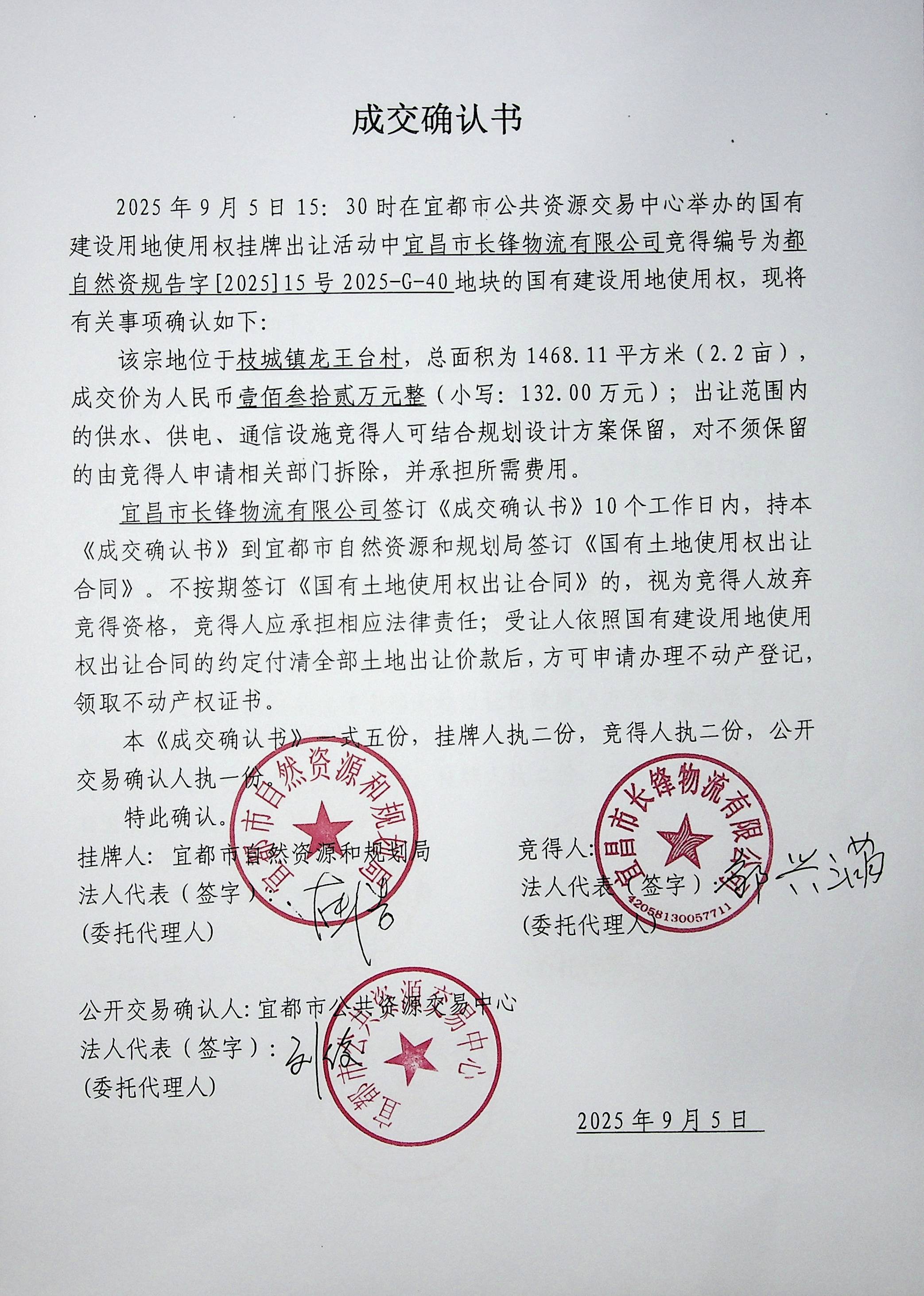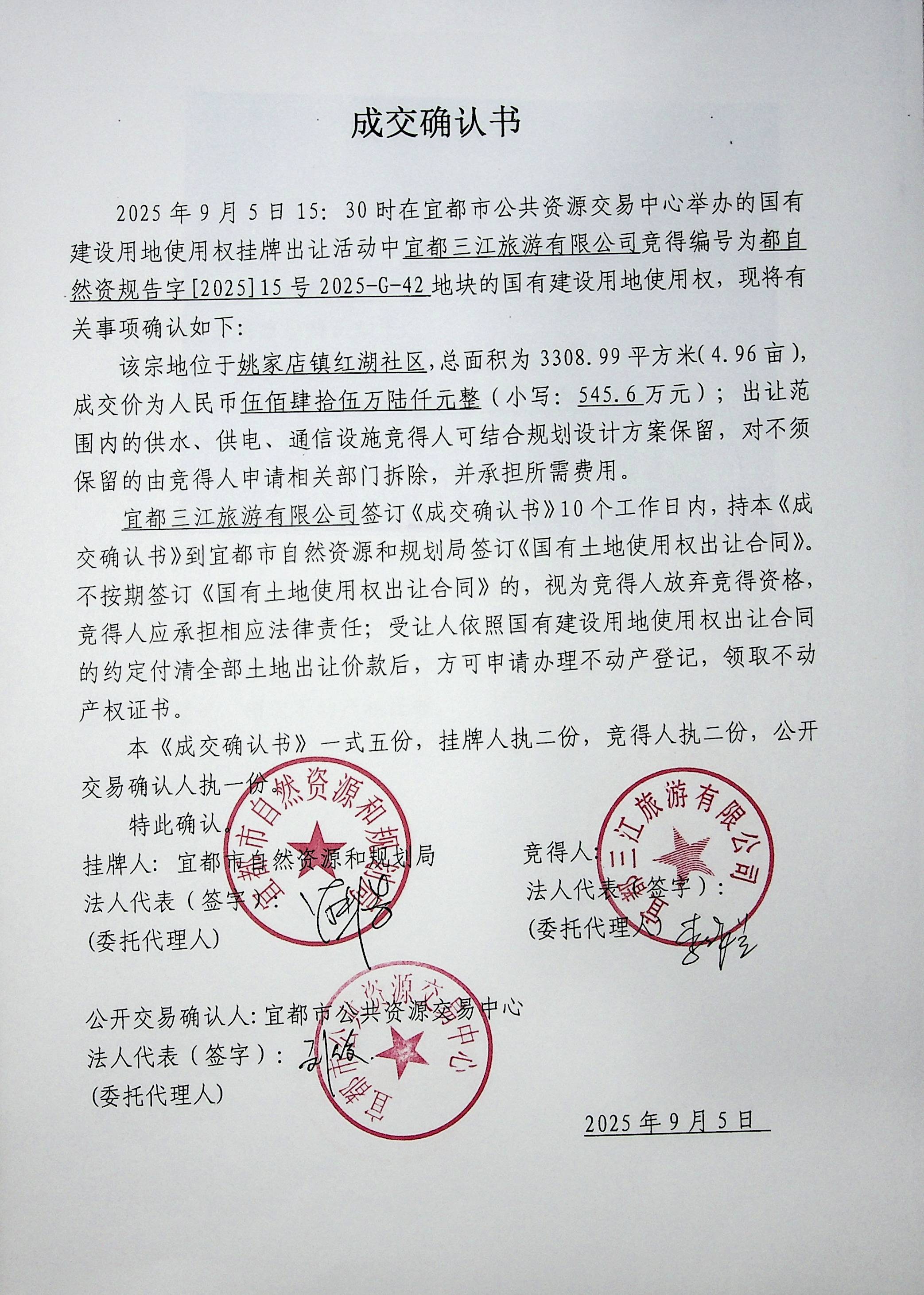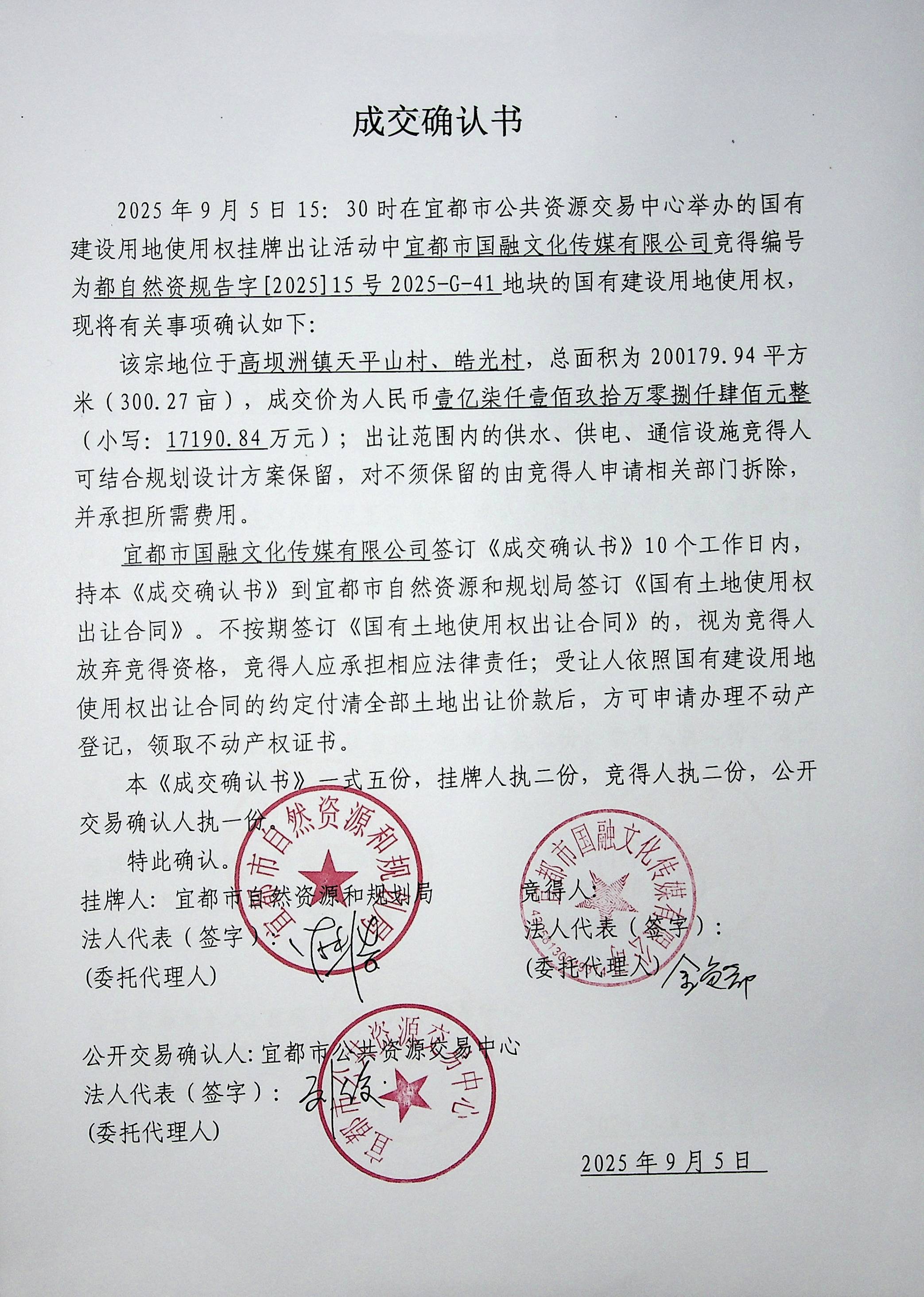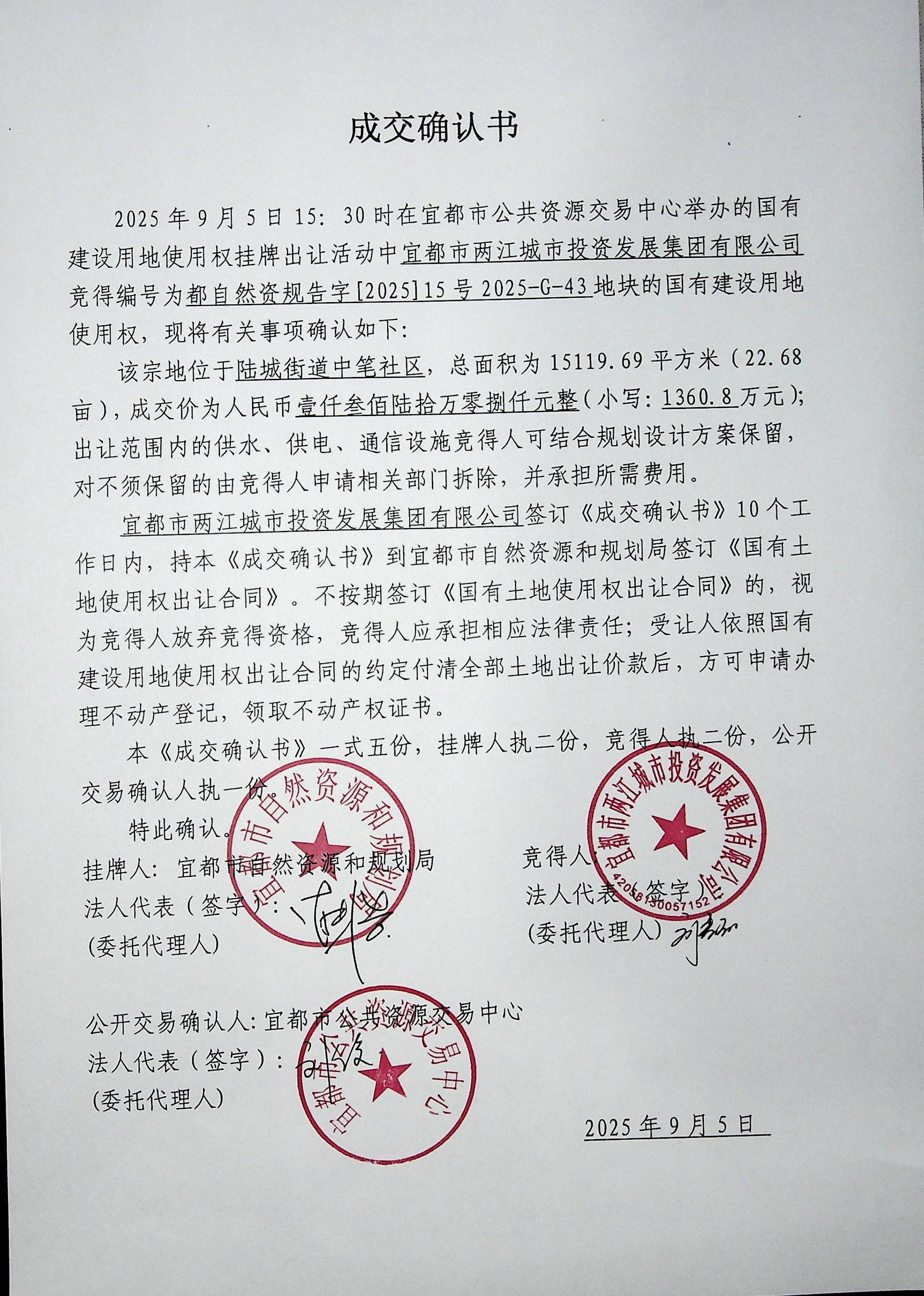 宜都市自然资源和规划局国有建设用地使用权挂牌出让公告都自然资规告字[2025]15号地块成交确认书