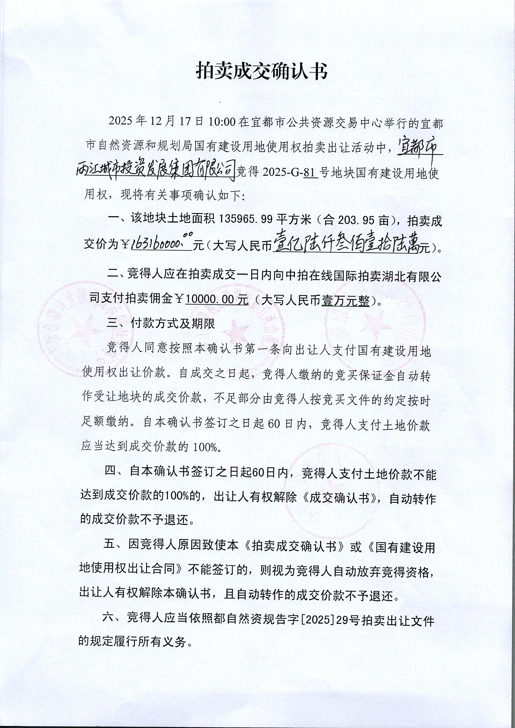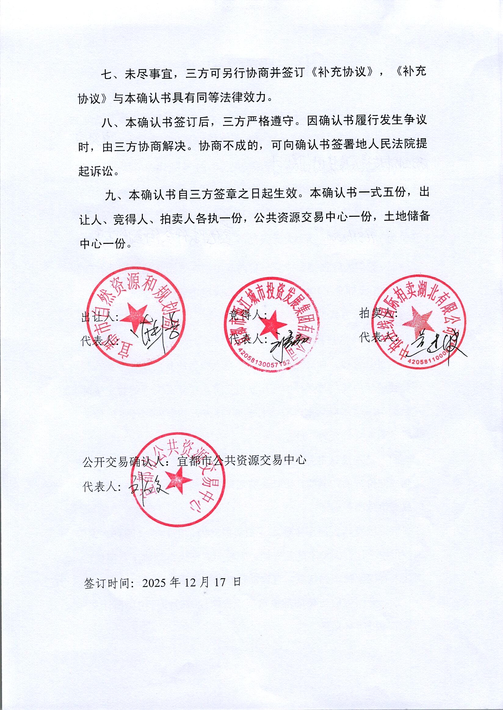 宜都市自然资源和规划局国有建设用地使用权拍卖出让公告都自然资规告字[2025]29号地块成交确认书