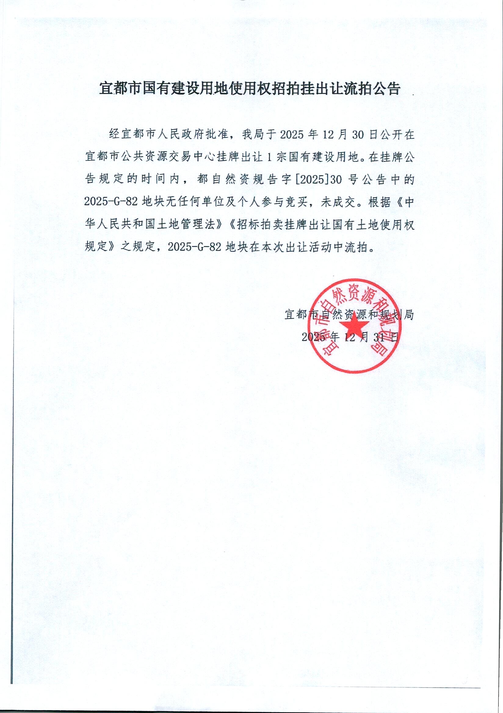 宜都市自然资源和规划局国有建设用地使用权挂牌出让公告都自然资规告字[2025]30号地块2025-G-82流拍公告