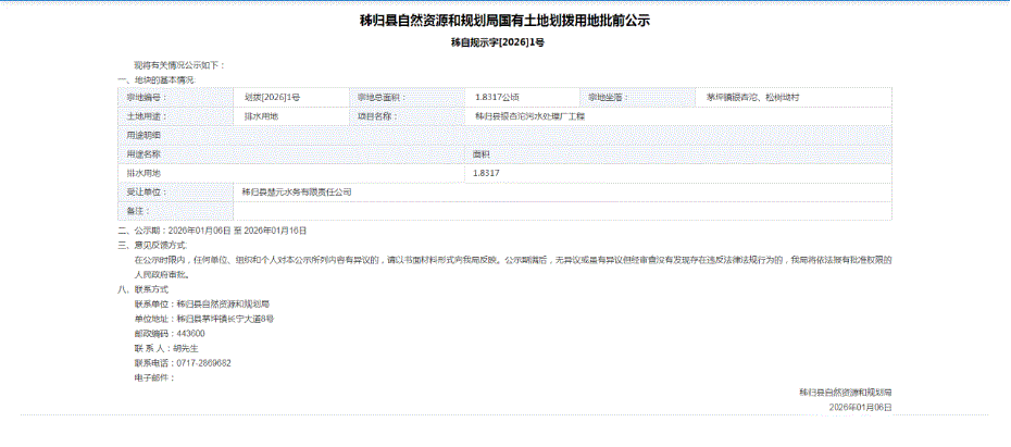 秭归县自然资源和规划局国有土地划拨用地批前公示(秭自规示字[2026]1号)