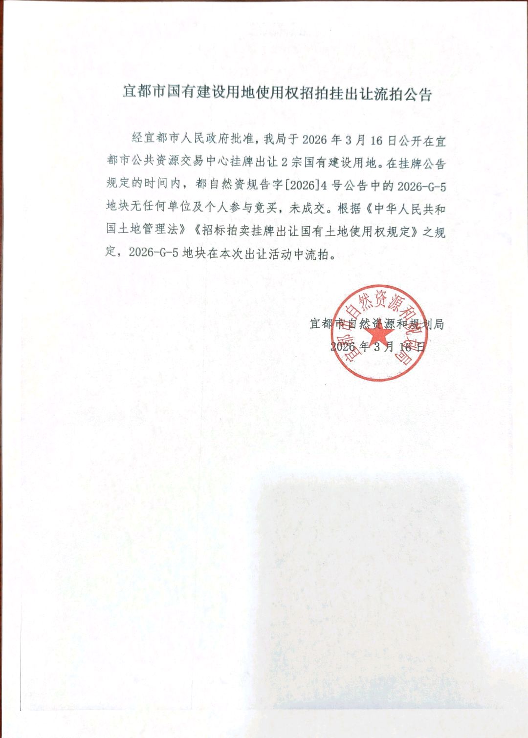 宜都市自然资源和规划局国有建设用地使用权挂牌出让公告都自然资规告字[2026]4号地块2026-G-5流拍公告