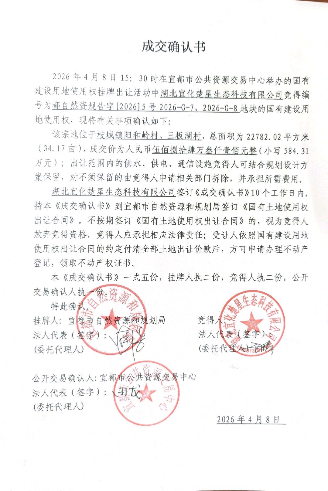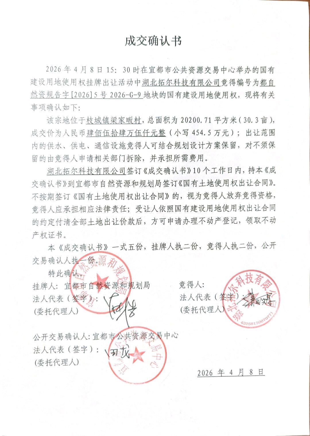 宜都市自然资源和规划局国有建设用地使用权挂牌出让公告都自然资规告字[2026]5号地块成交确认书