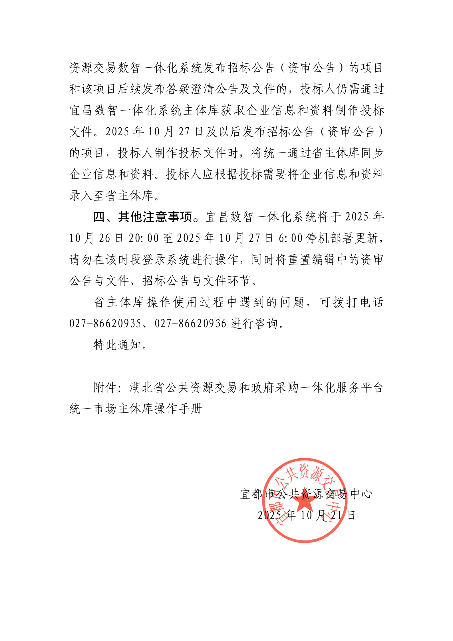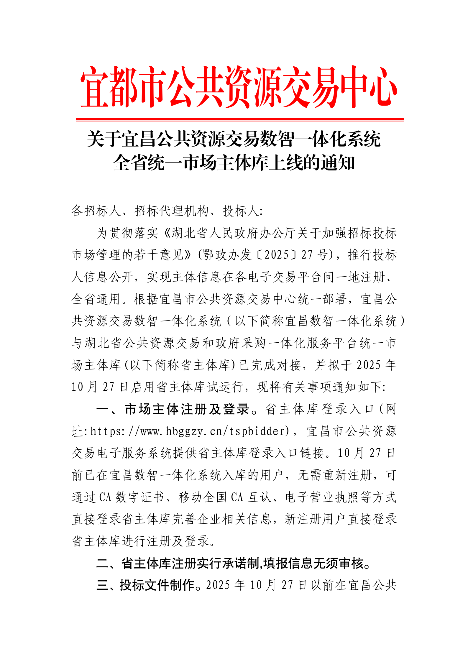 关于宜昌公共资源交易数智一体化系统全省统一市场主体库上线的通知