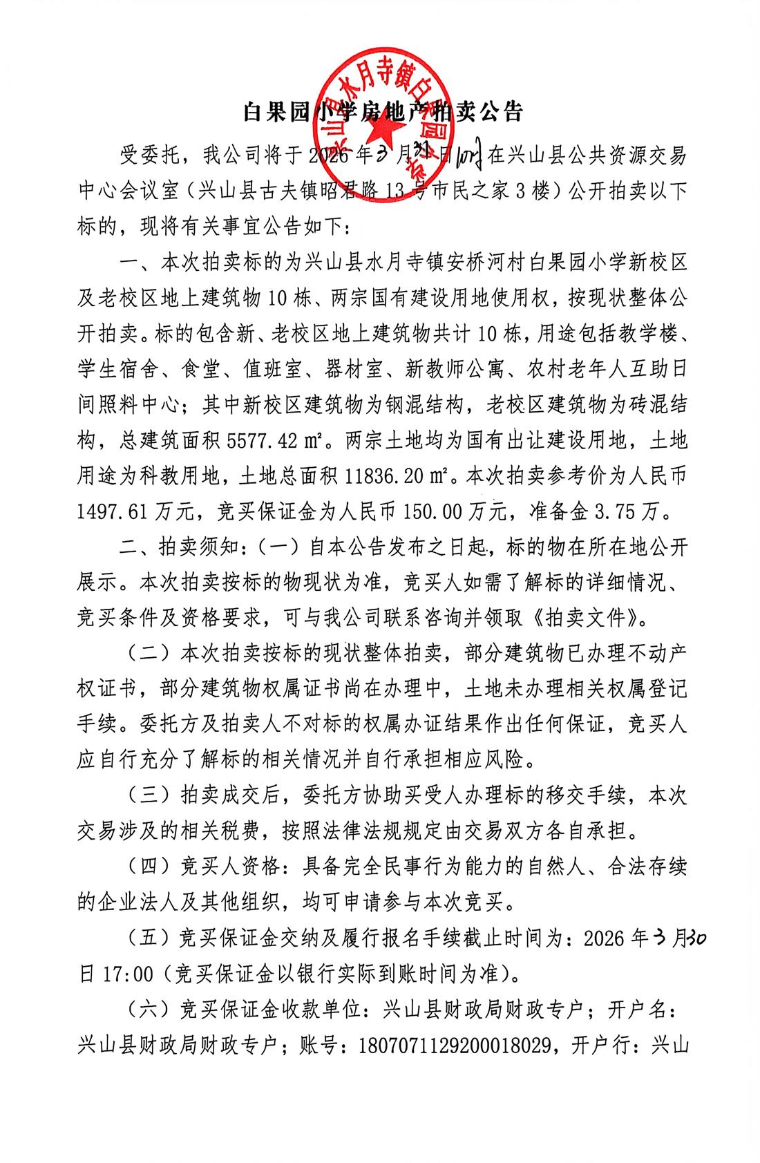兴山县水月寺镇白果园小学房地产拍卖公告