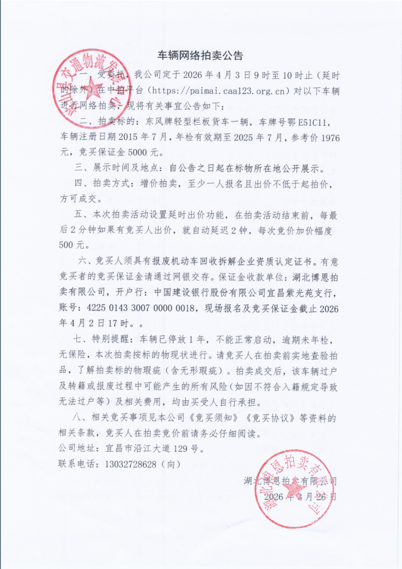 兴山县交通物流发展中心车辆拍卖公告