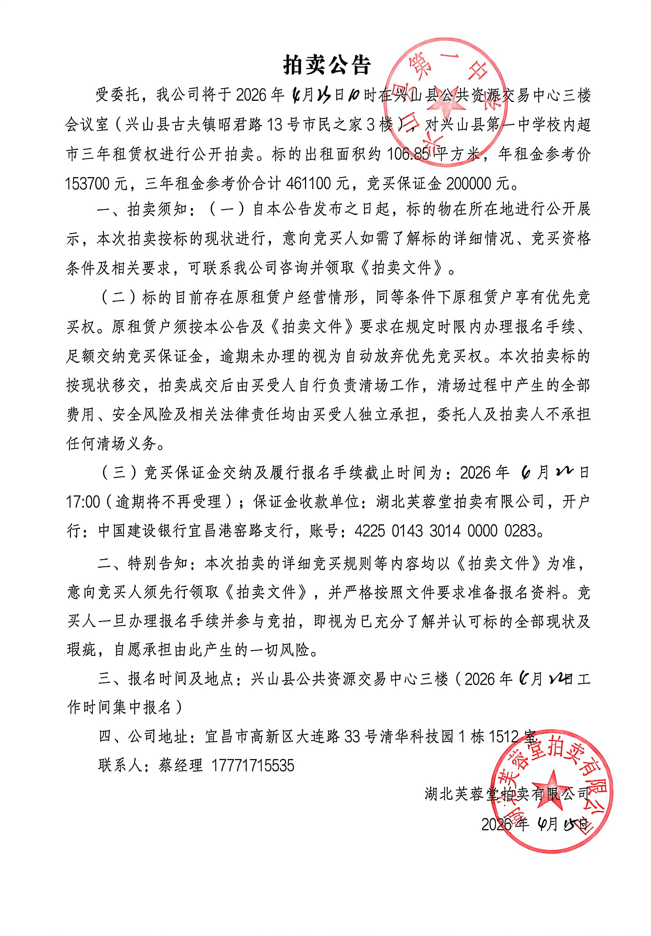 兴山县第一中学校内超市三年租赁权拍卖公告