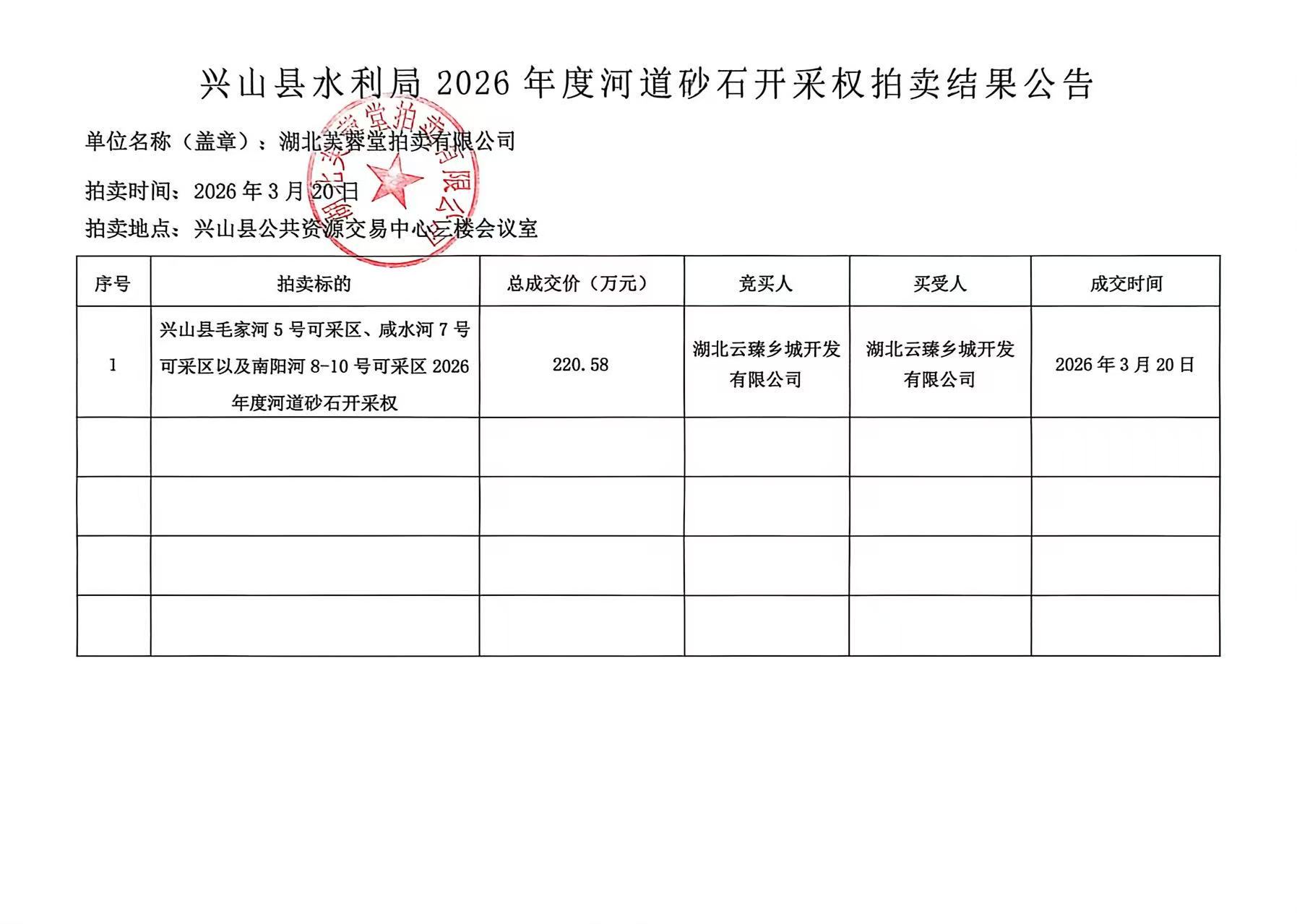 兴山县水利局2026年度河道砂石开采权拍卖结果公告
