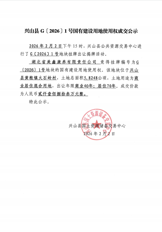 兴山县G〔2026〕1号国有建设用地使用权成交公示
