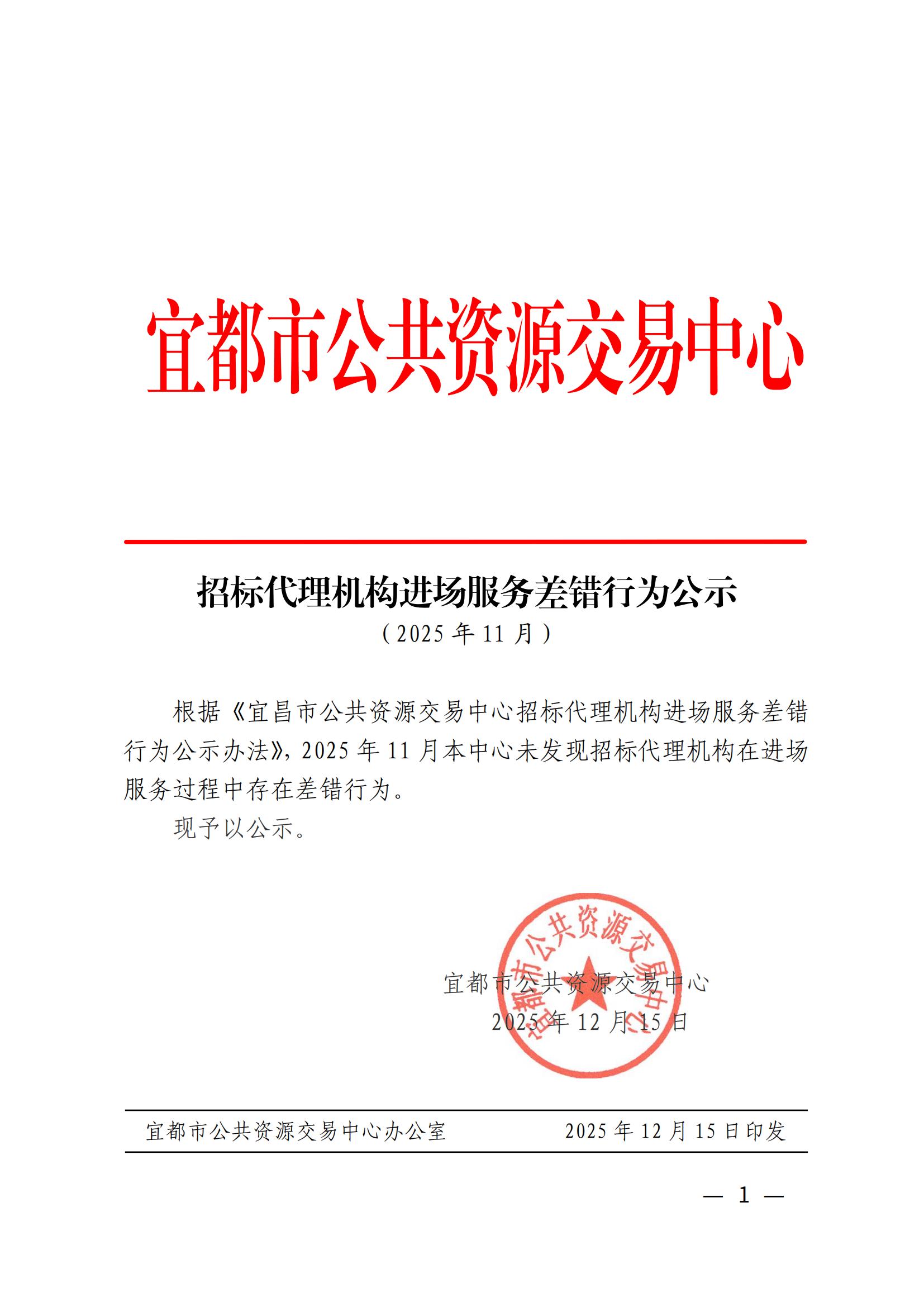 招标代理机构进场服务差错行为公示(2025年11月)