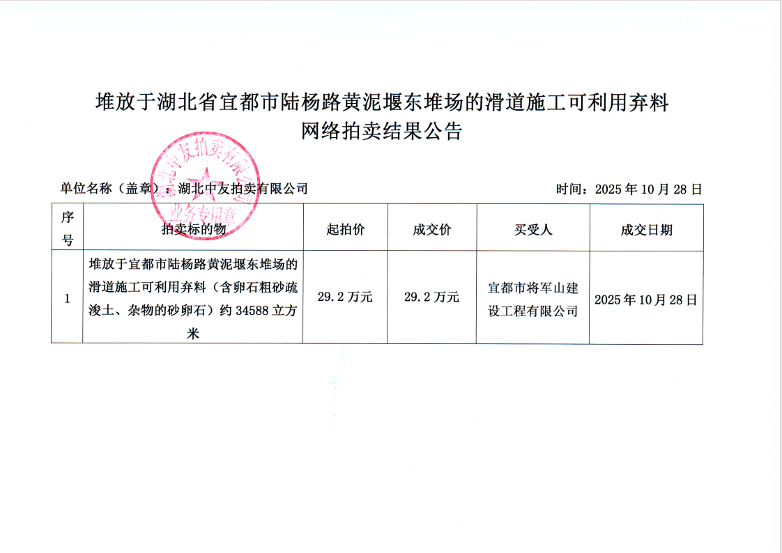 堆放于湖北省宜都市陆杨路黄泥堰东堆场的滑道施工可利用弃料网络拍卖结果公告(第二次)