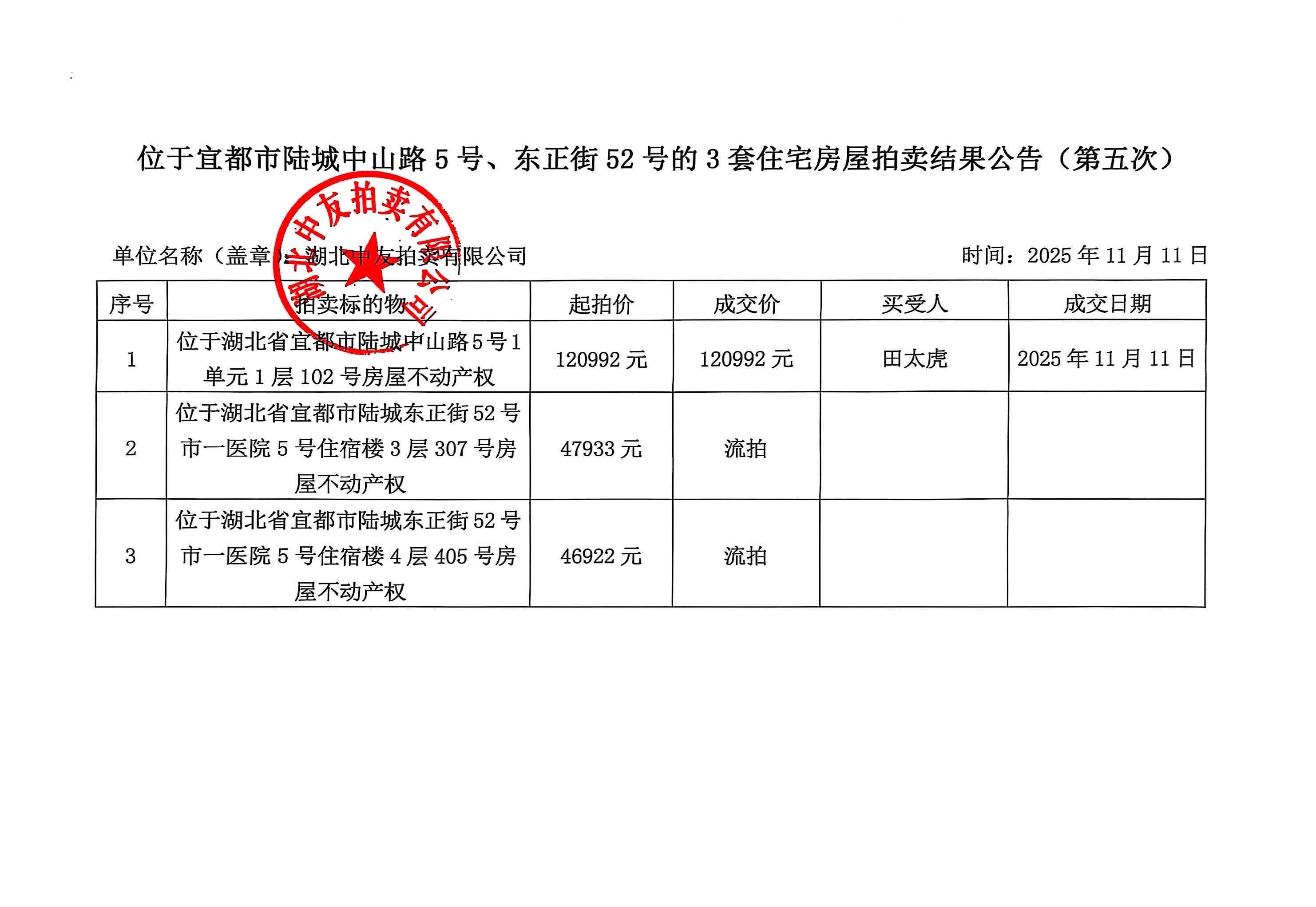 位于宜都市陆城中山路5号、东正街52号的3套住宅房屋拍卖结果公告(第五次)
