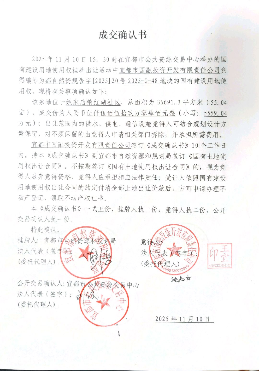 宜都市自然资源和规划局国有建设用地使用权挂牌出让公告都自然资规告字[2025]20号地块成交确认书