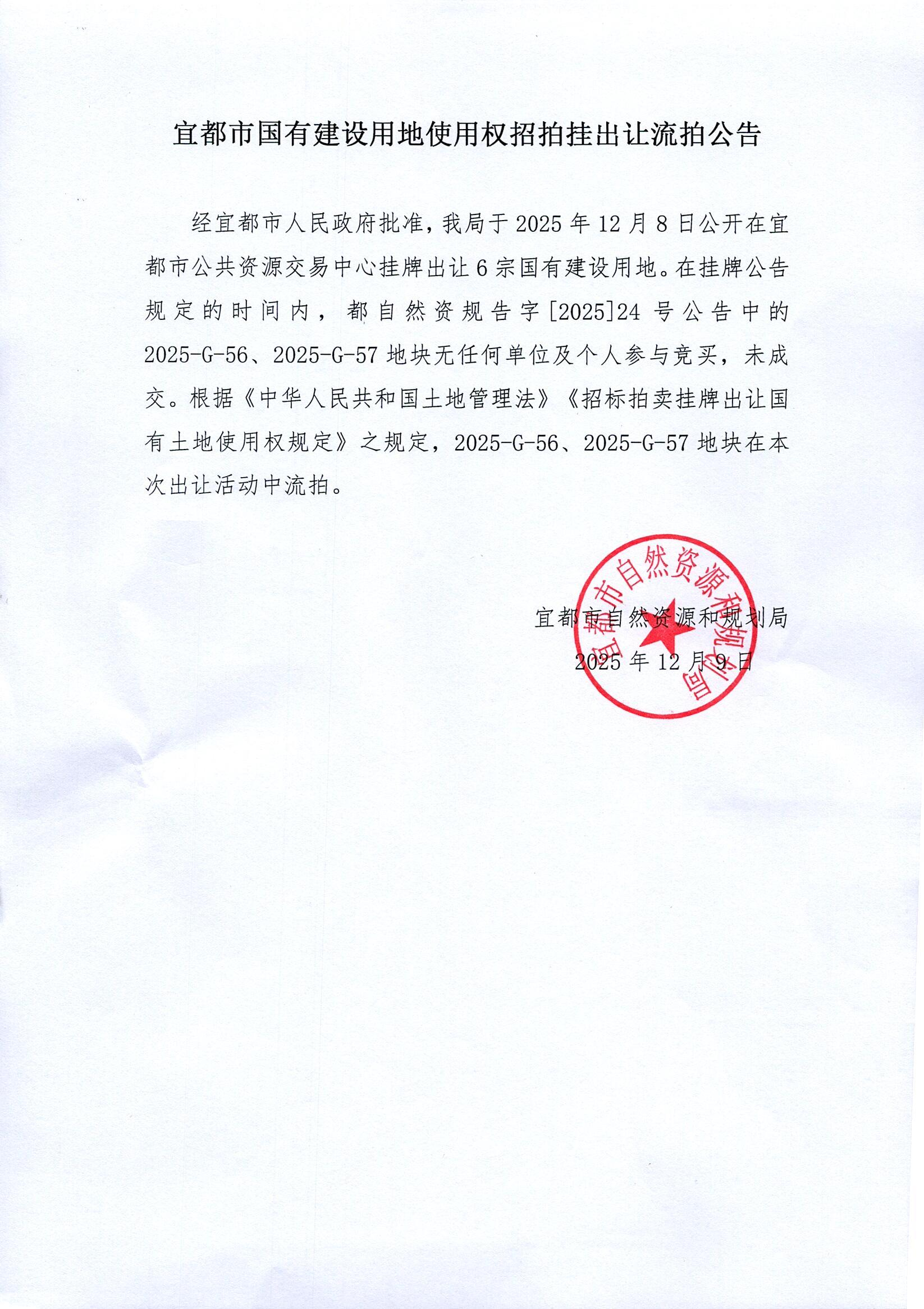 宜都市自然资源和规划局国有建设用地使用权挂牌出让公告都自然资规告字[2025]24号地块中2025-G-56.2025-G-57流拍公告
