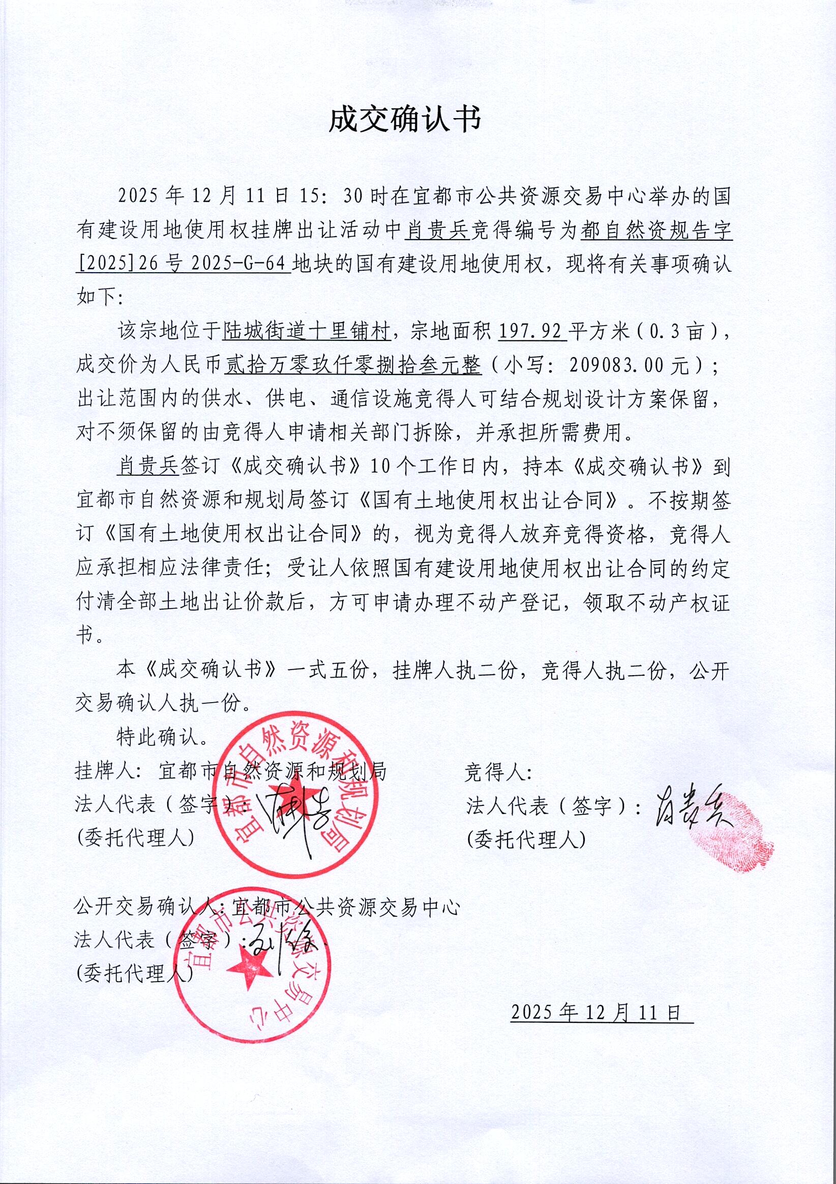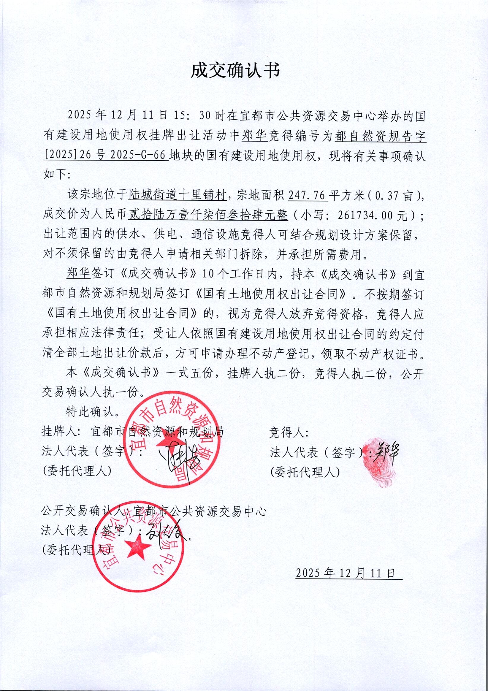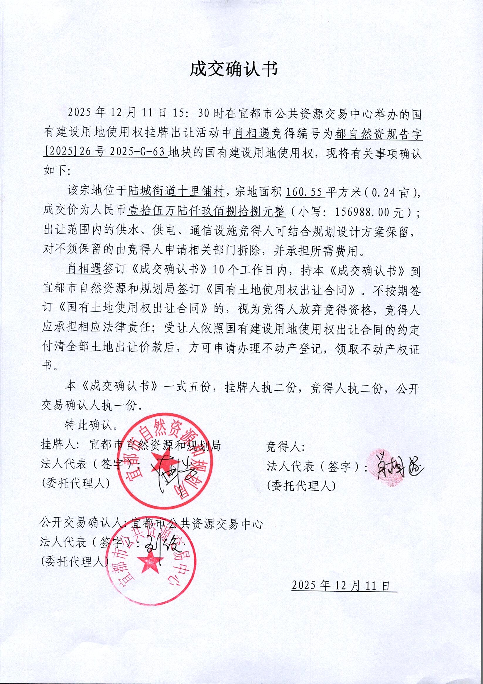 宜都市自然资源和规划局国有建设用地使用权挂牌出让公告都自然资规告字[2025]26号地块成交确认书