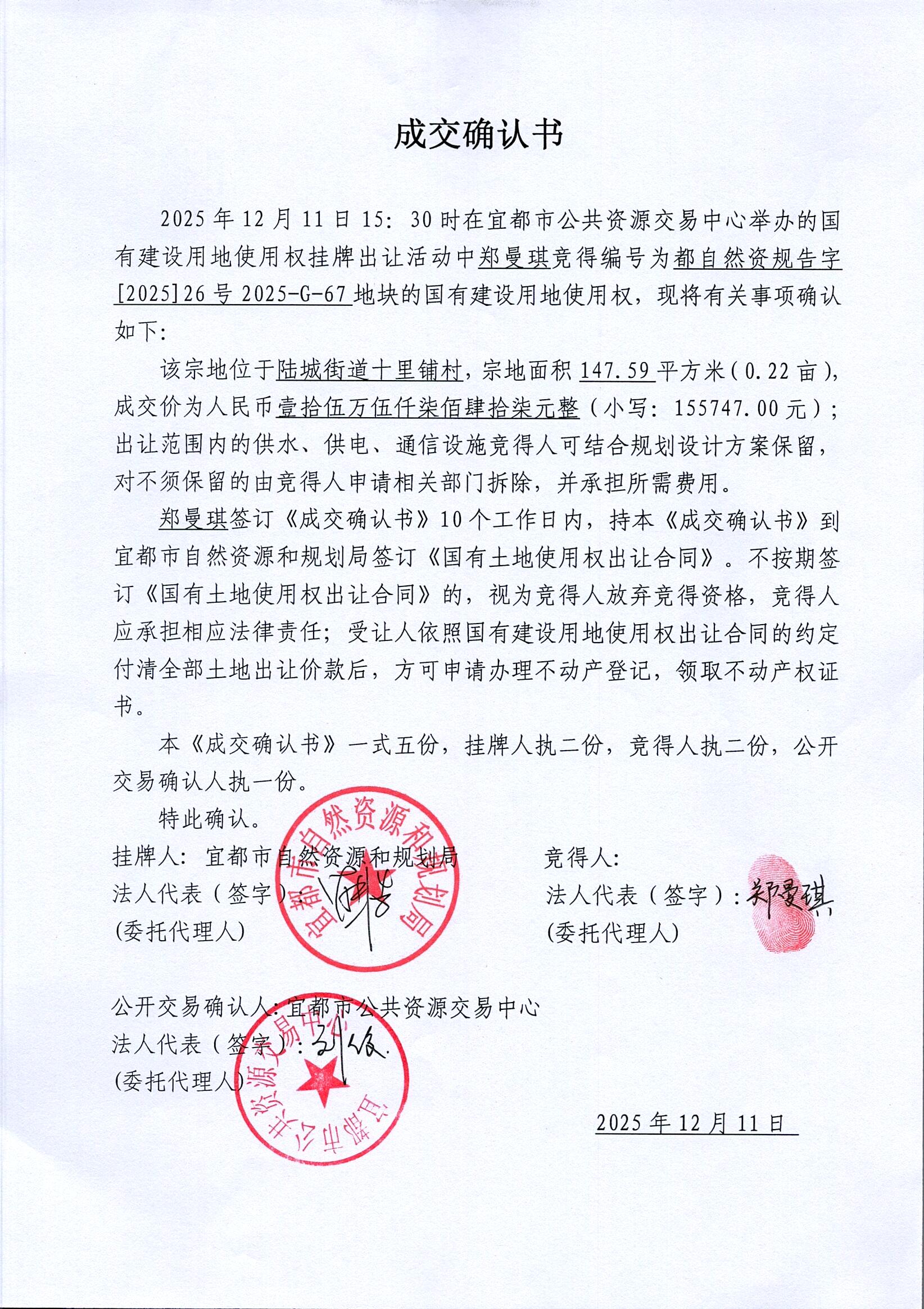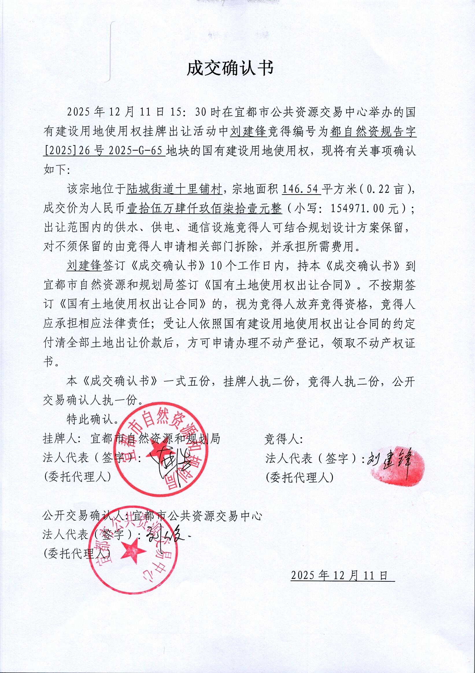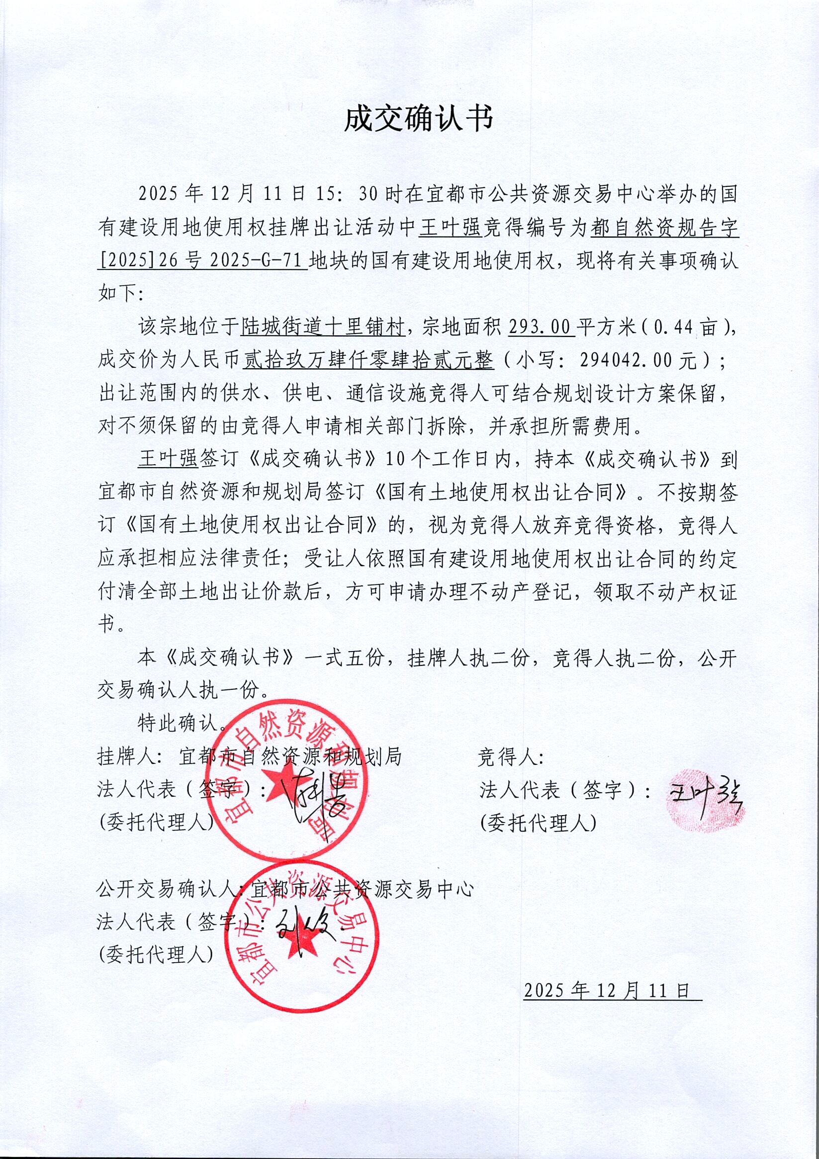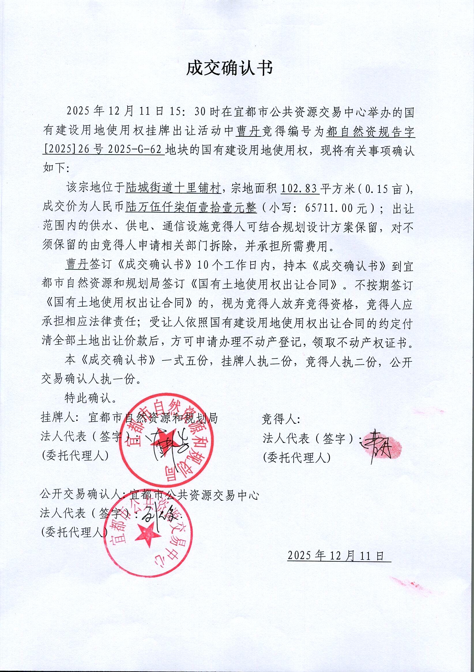 宜都市自然资源和规划局国有建设用地使用权挂牌出让公告都自然资规告字[2025]26号地块成交确认书