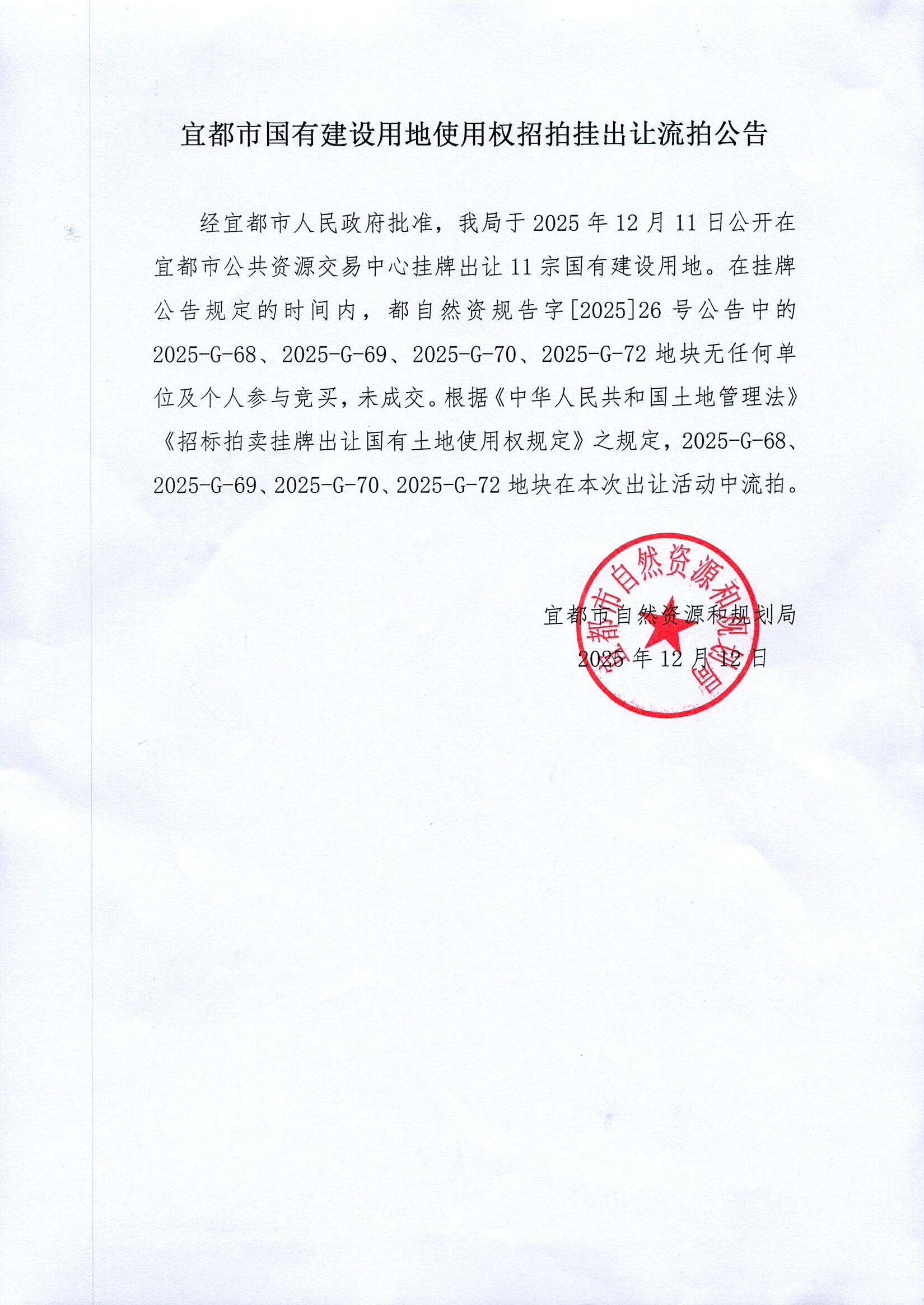 宜都市自然资源和规划局国有建设用地使用权挂牌出让公告都自然资规告字[2025]26号地块中2025-G-68.2025-G-69.2025-G-70.2025-G-72流拍公告