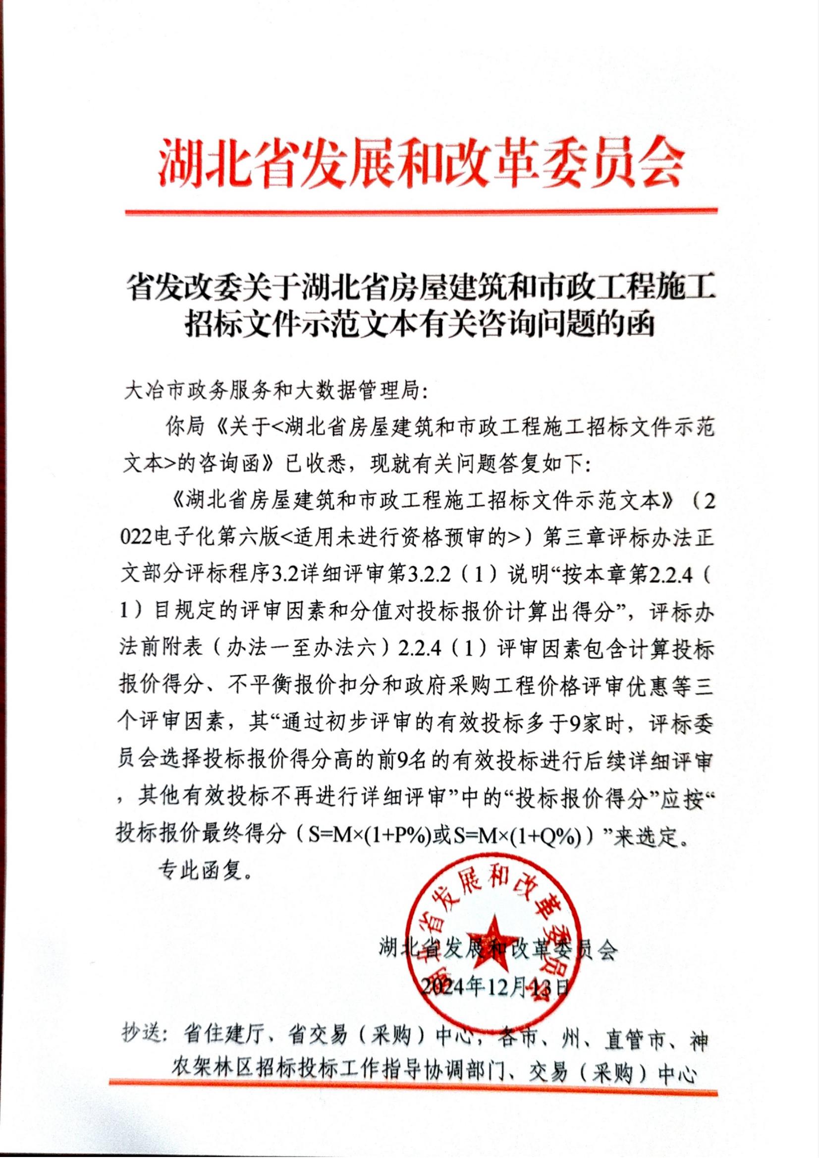 省发改委关于湖北省房屋建筑和市政工程施工招标文件示范文本有关咨询问题的函